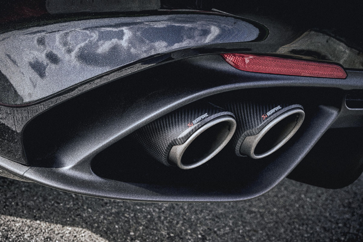 リヤには純チタン製マフラーを装備し、エンド部にはカーボン製フィニッシャーを組み合わせ、視覚的なスポーティさに加えて、アクラボビッチならではの高く乾いた排気音がドライバーの感性を刺激し、至極のドライビングを楽しむことができる。