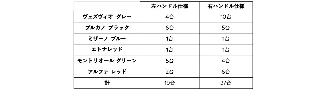 ボディカラーは、「ヴェズヴィオ グレー」、「ブルカノ ブラック」、「ミザーノ ブルー」、「エトナレッド」、「モントリオール グリーン」、そして「アルファ レッド」の6色展開となっている。