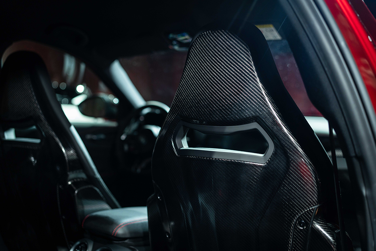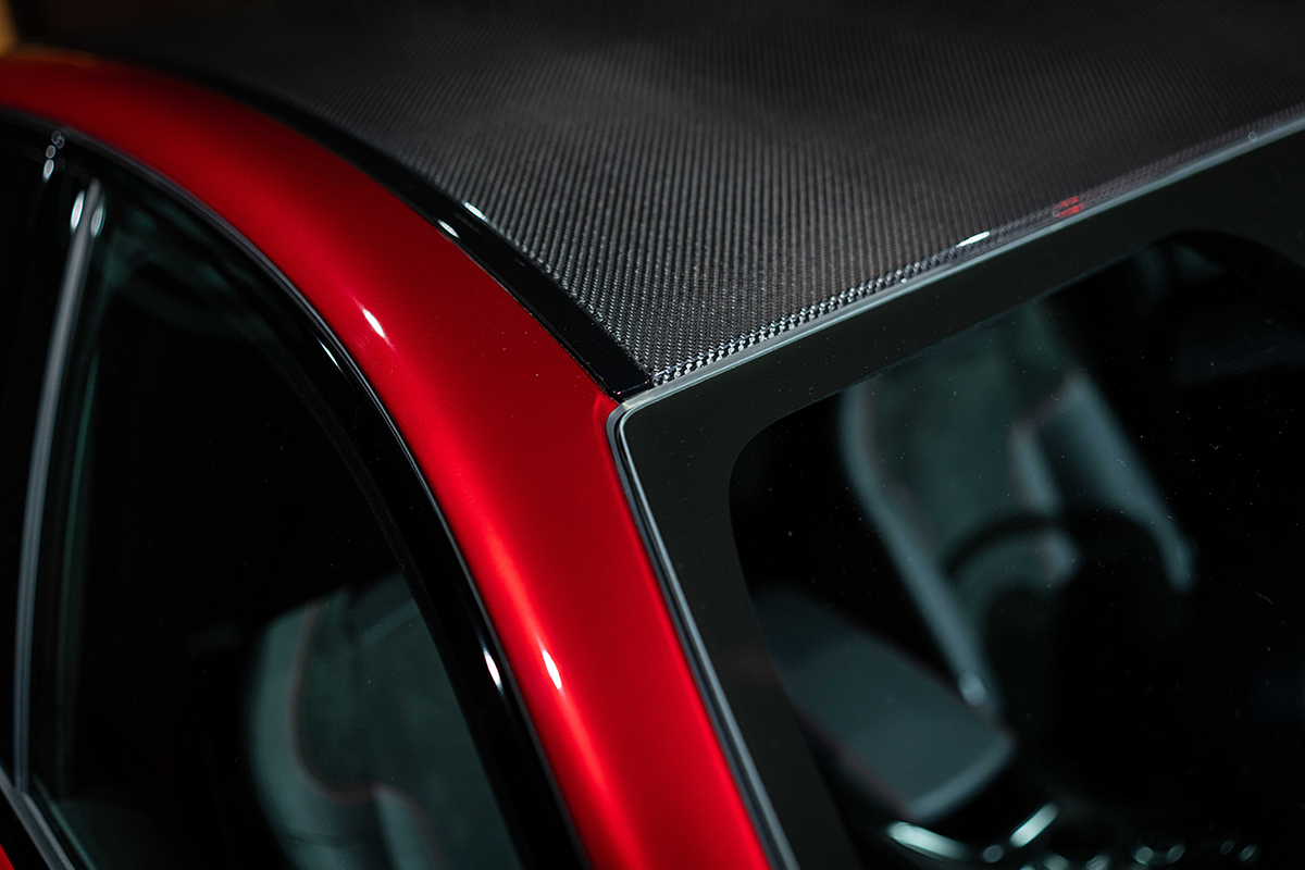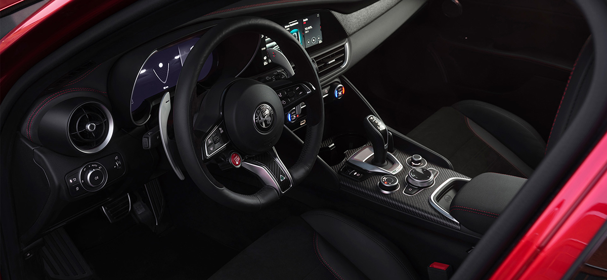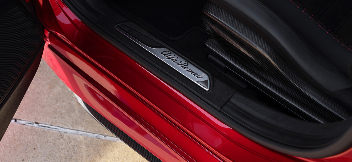 ブレーキキャリパーには、高い信頼性と優れた仕上げで知られるBrembo(ブレンボ)製のブラックのキャリパーを採用した上、特別なアノダイズド加工(アルマイト加工)を施し、赤いAlfa Romeoロゴを配した特別なもの。アノダイズド加工は、高い耐久性と放熱性を備えるレース由来の技術だ。マット調ながら金属の質感を残す独特の仕上がりが、外装のカーボンパーツと調和し、精悍な印象をいっそう引き立ててくれる。ジュリアには、カーボンルーフも採用されている。