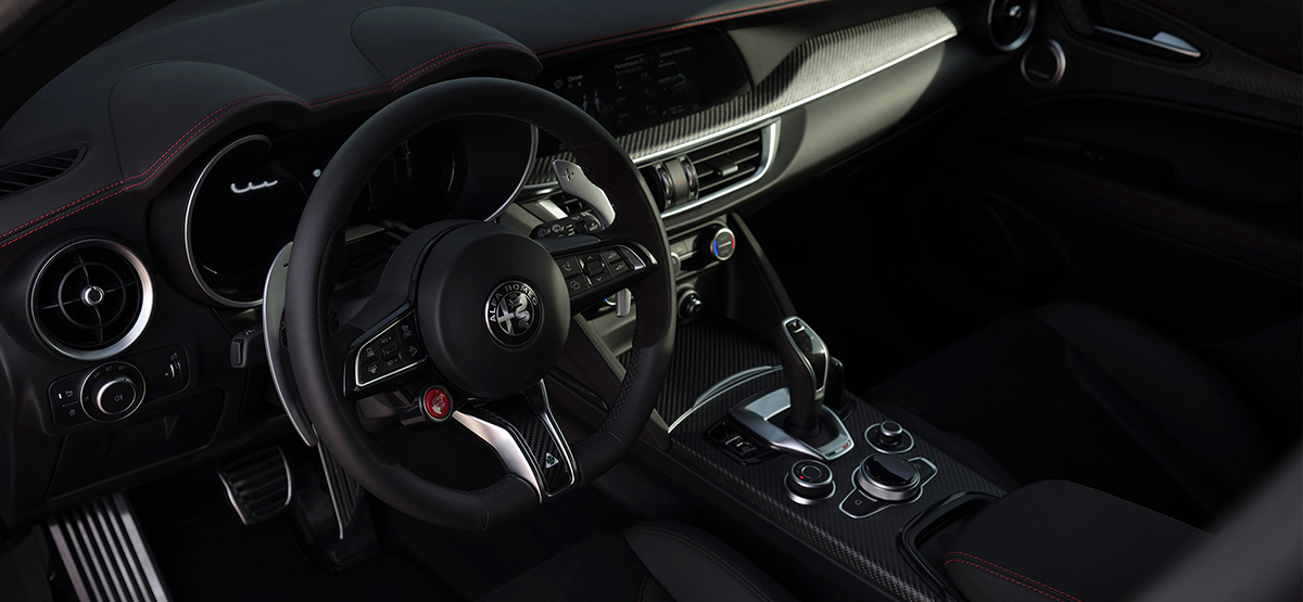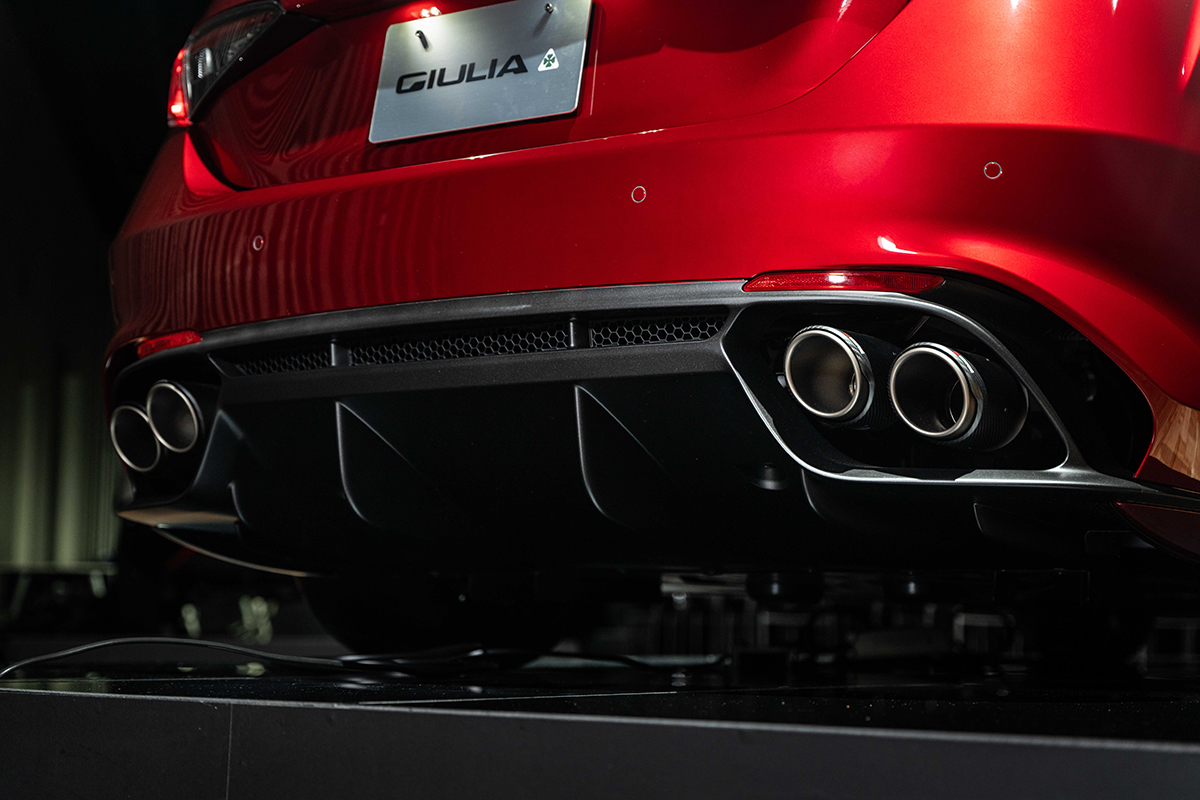 ジュリアにおいては、エンジン、吸排気にも手が入る。エキゾーストには、スロベニア共和国に本社を置く世界的なエキゾーストメーカー、Akrapovic(アクラポビッチ)製のシステムを採用。排気効率の最適化や軽量化を実現。テールは純チタン製マフラーを備え、エンド部にはカーボン製フィニッシャーを組み合わせることで視覚的なスポーティさとともに、アクラポビッチならではの高く乾いた排気音がドライバーの感性を刺激する。
