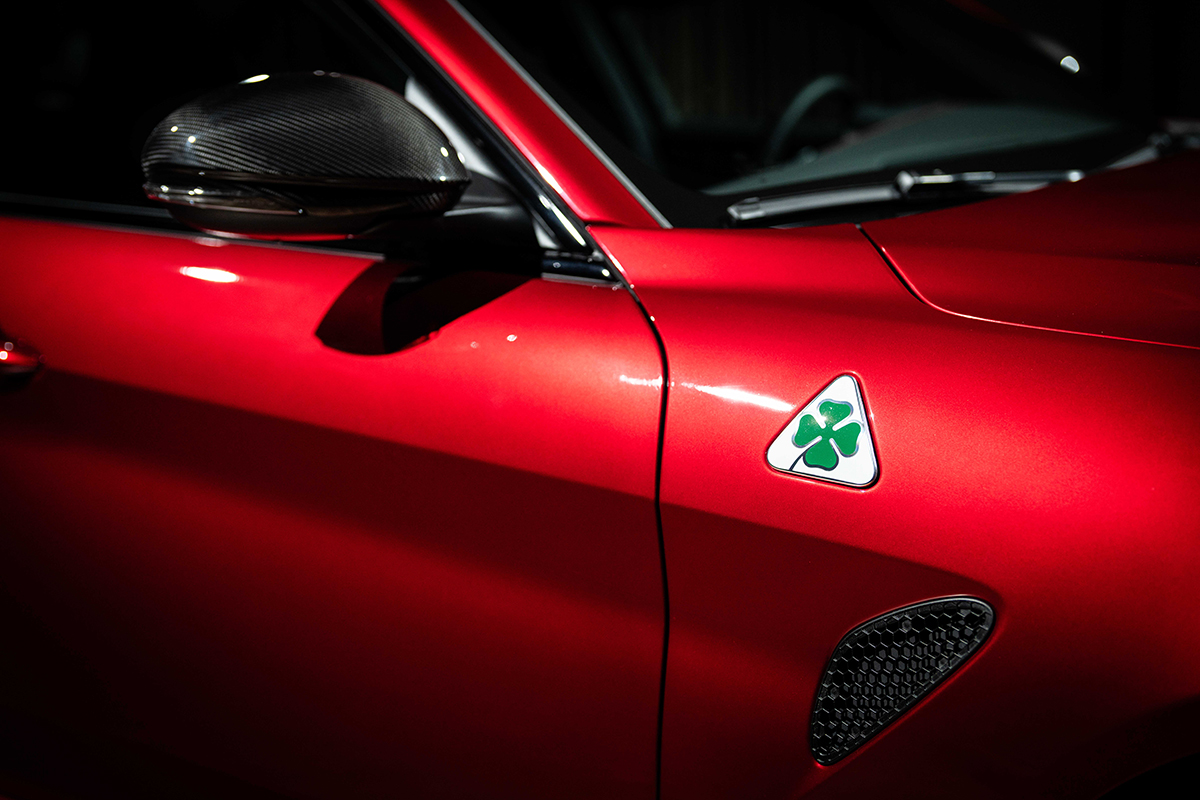 アルファロメオにおいて、“赤”は特別なもの。時代に応じてパステル調からメタリック、近年採用される三層構造塗装へと変化し、その都度ブランドの進化を表現してきた。なかでも「ロッソ・ヴィッラ・デステ」は、深みのある赤と陰影が織りなす美しさで知られる代表的なカラーで、光の加減によって黒みを帯びる、変化に富んだ豊かな表情が特徴だ。