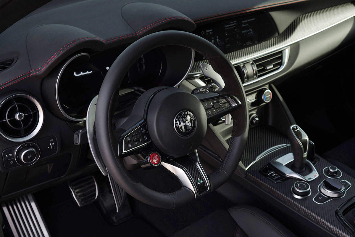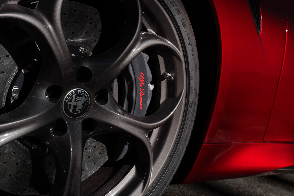 ブレーキキャリパーは、高い信頼性と優れた仕上げで知られるブレンボ製のブラックのキャリパーを採用し、特別なアルマイト加工を施し、赤いアルファロメオ・ロゴを配している。マット調ながら金属の質感を残す独特の仕上がりが、外装のカーボンパーツと調和し、精悍な印象をいっそう引き立てる。