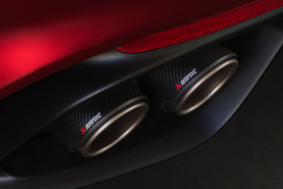 また、「ジュリア クアドリフォリオ コレッツィオーネ」は、専用装備としてカーボンルーフを採用。そして、エキゾーストには、世界のモータースポーツ分野において圧倒的な信頼を得ているアクラポビッチ製の排気システムを採用し、排気効率の最適化や軽量化を図りっている。また、リヤ部は純チタン製マフラーを装備し、エンド部にはカーボン製フィニッシャーを組み合わせている。視覚的なスポーティさに加えて、アクラボビッチならではの高く乾いた排気音がドライバーの感性を刺激し、至高の運転を味わうことができる。