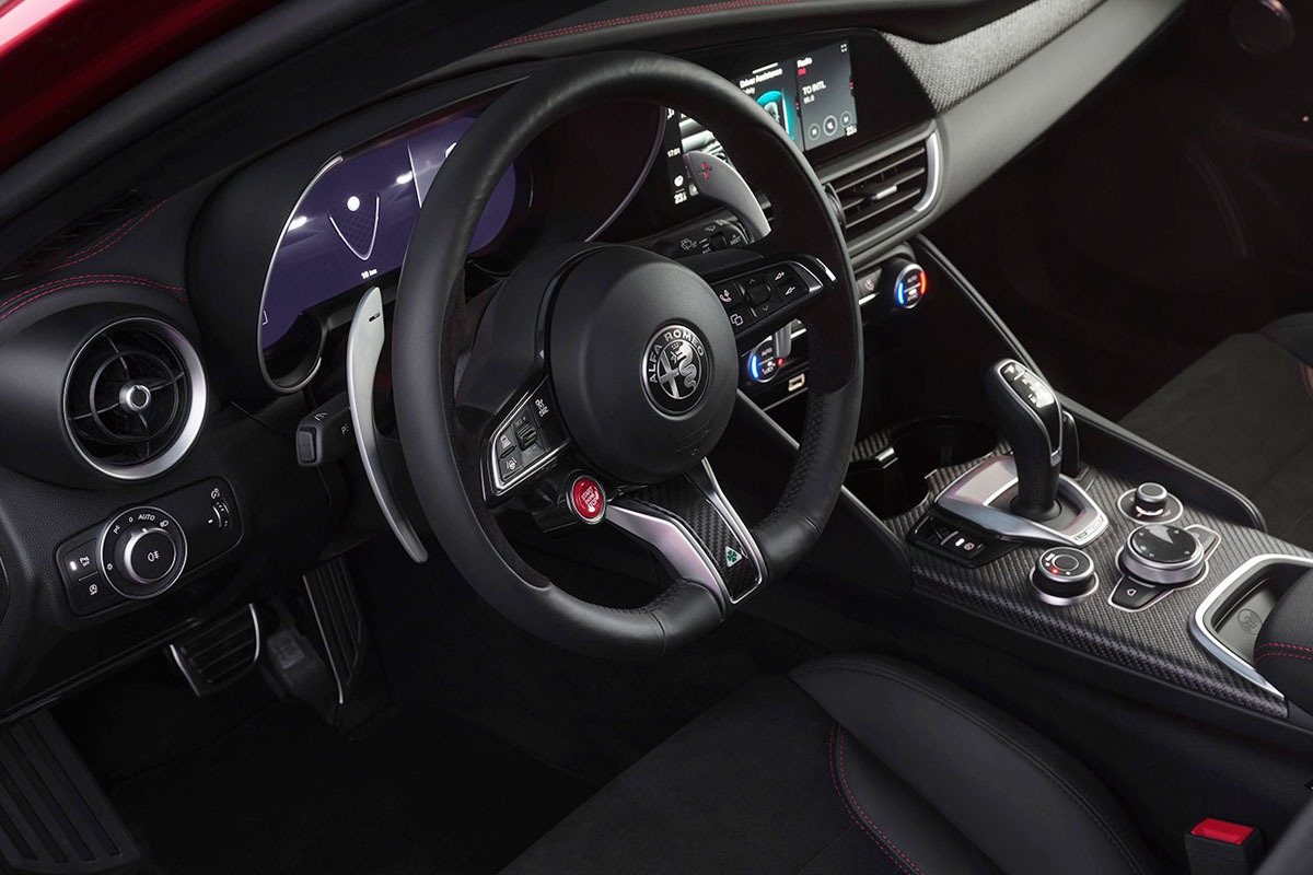 さらに「ジュリア クアドリフォリオ コレッツィオーネ」のエンジンの燃料噴射方式は従来の直噴単体から、直噴とポート噴射を組み合わせたデュアル噴射方式に刷新。インジェクター数も6本から12本へ増設している。*この新方式では、低負荷時はポート噴射を用いて燃費性能を高めつつ、カーボン堆積や窒素酸化物の発生を抑制し、高負荷時は直噴で高出力を確保。あわせてキャリブレーション変更とECUマッピングの最適化を実施し、燃費・排出ガス性能と高出力の両立を図り、最高出力は6500rpmで520ps(従来は6500rpmで510ps)を発揮する。