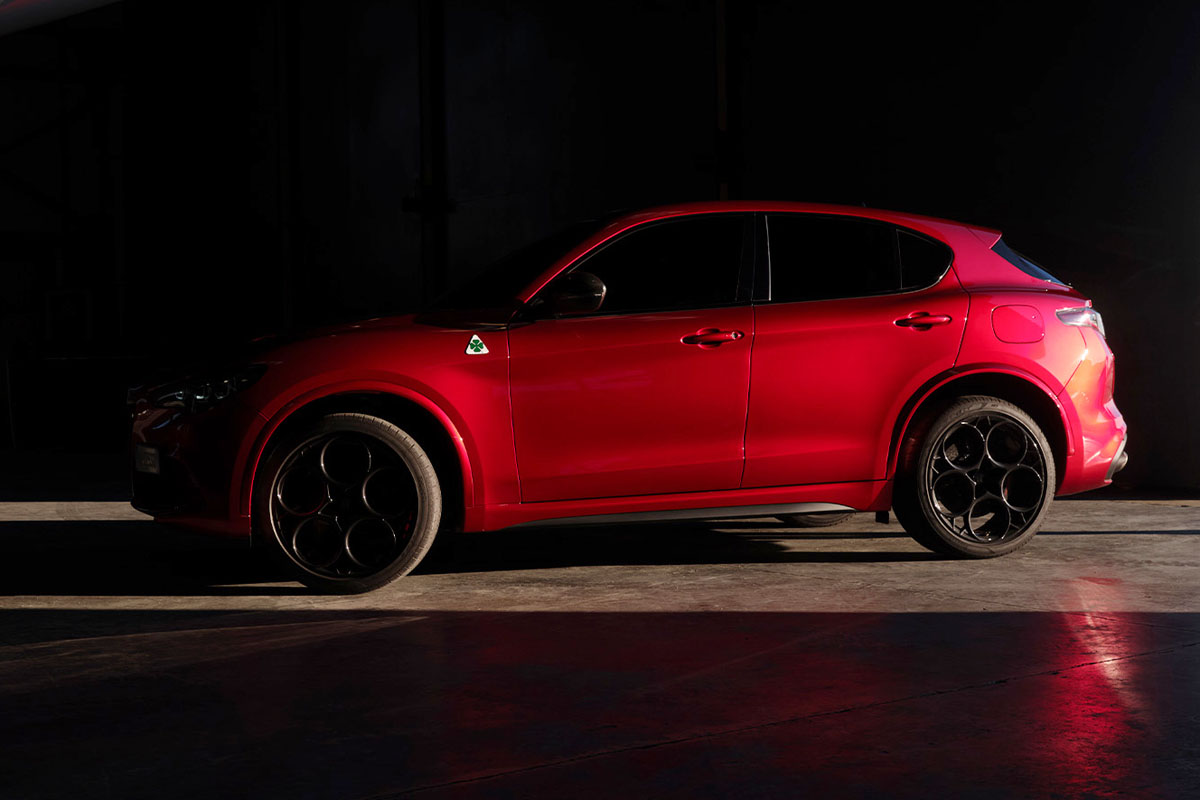 「ステルヴィオ コレッツィオーネ レッド」は、SUVの力強いプロポーションと調和する明るい赤で、鮮やかな発色が逞しさと躍動感を印象づける。