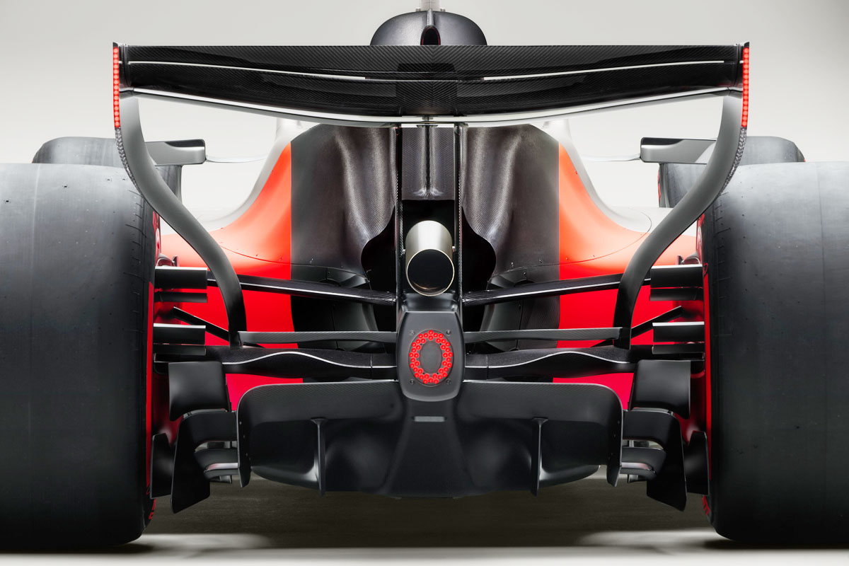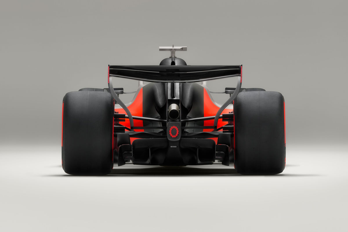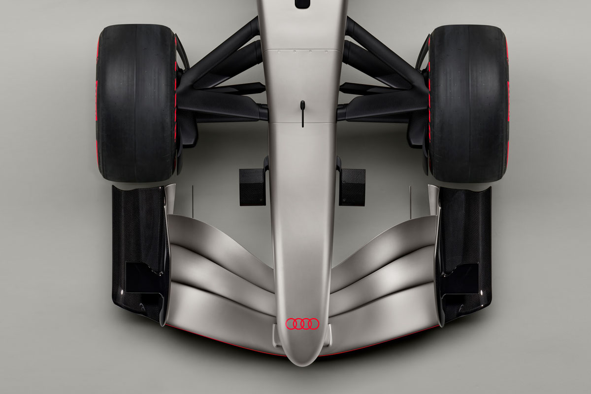 ミニマルなグラフィック・サーフェスは、正確な幾何学的カットが施され、レーシングカーのフォルムとシームレスに一体化されている。カラーは、チタニウム、カーボンブラック、そして新たに導入されたアウディ・レッドで構成されている。赤い4リングスもF1での存在感を際立たせるアイデンティティの一つと位置づけられている。