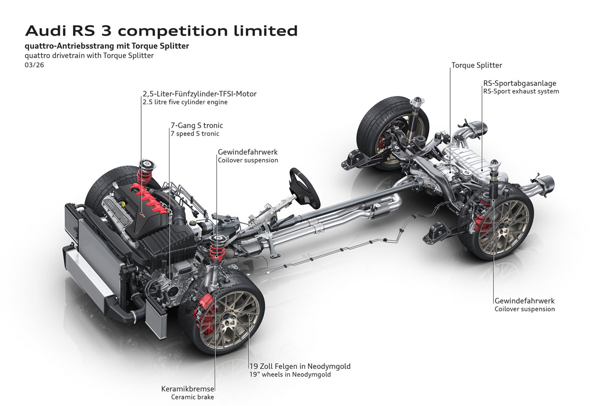 アウディスポーツ本社は2026年3月10日、伝説的な存在となっている5気筒エンジンの誕生50周年を祝って、エクスクルーシブな特別仕様モデル「RS 3 competition limited」を初公開した。