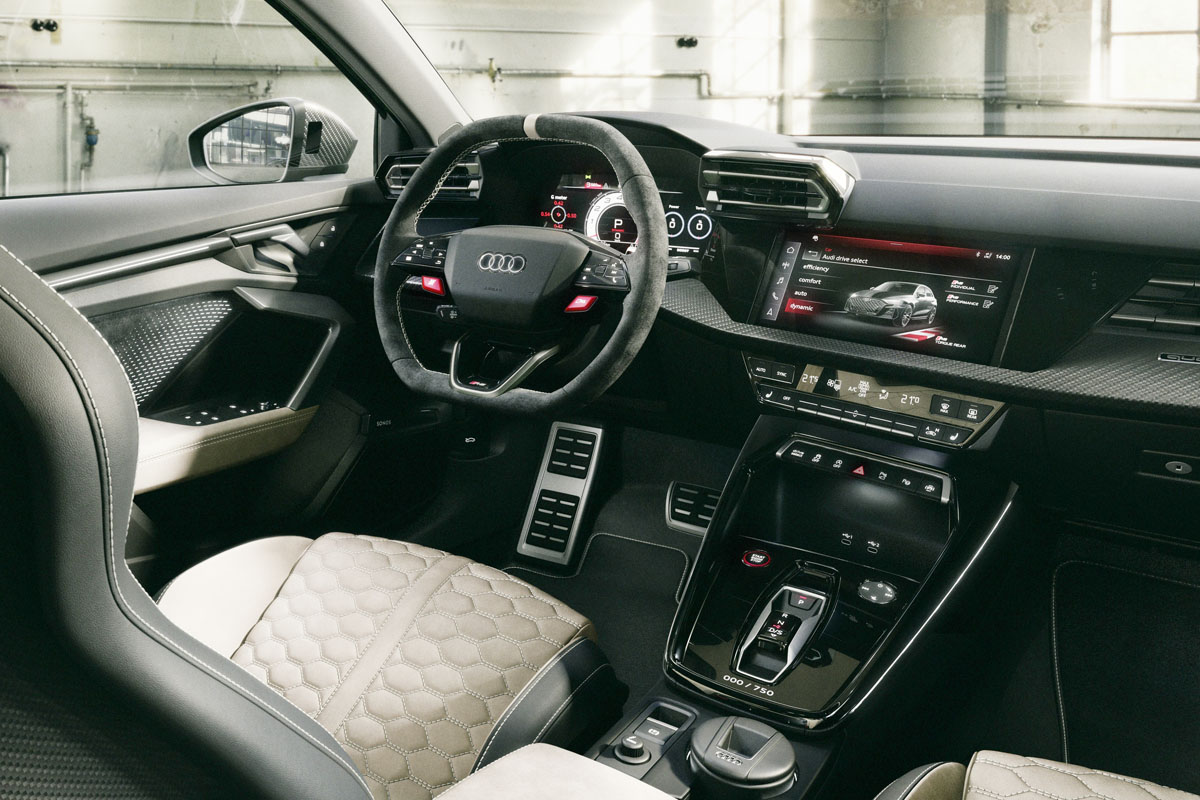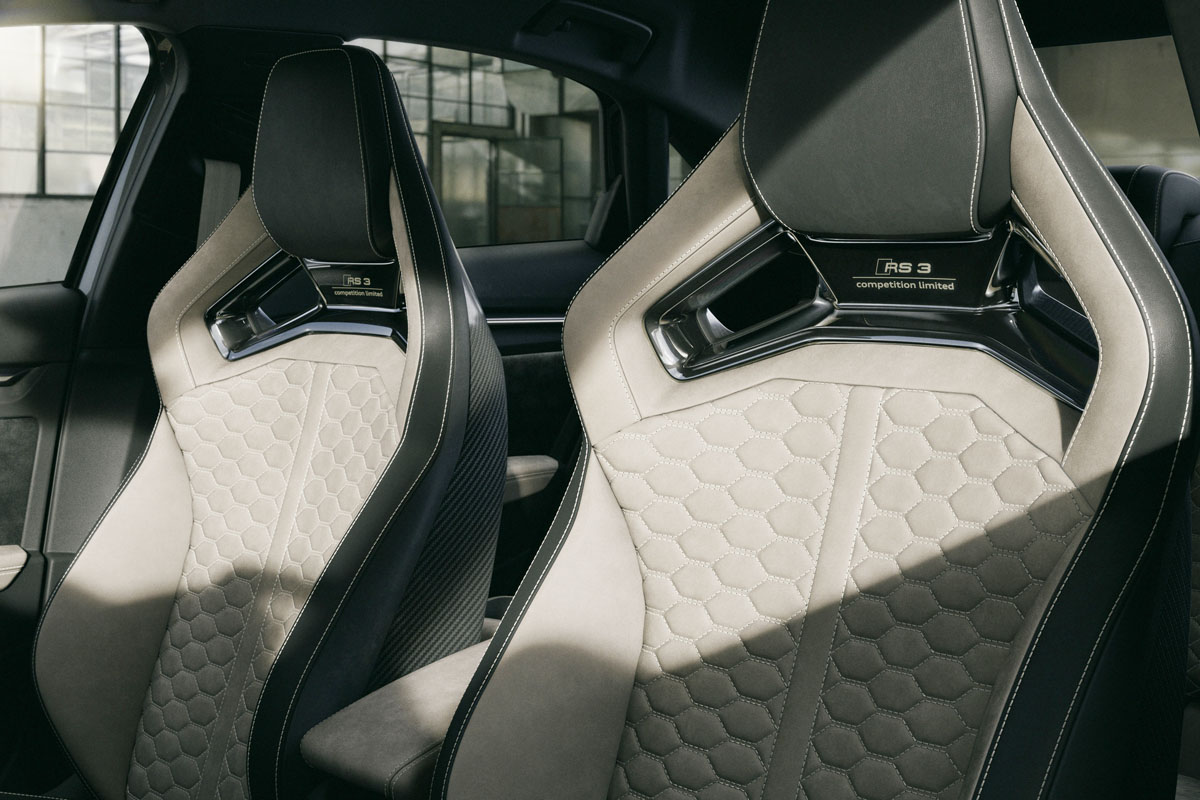 インテリアは、ブラック、ネオジムゴールド、ジンジャーホワイトのカラーコンビネーションが特別感を生み出す。ドアの照明は「RS 3 competition limited」のロゴを投影し、同じロゴがブラックのフロアマット、ヘッドレスト下のカバー、そしてトランクカーペットにも刻まれている。