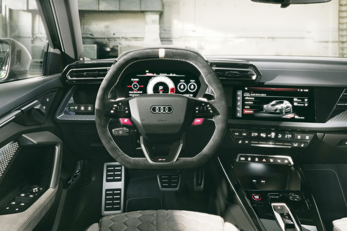 アウディバーチャルコックピットプラスもエクスクルーシブなデザインだ。かつてのRS2 アヴァントのイメージを継承するホワイト背景のデジタルメーターパネルとし、エンジン出力とトルク、Gフォース、加速タイム、およびラップタイマーが表示される。ローンチコントロールでターボチャージャー付き直列5気筒の加速ポテンシャルを最大限に活用する際には、スターティングライトが最適な発進タイミングを表示する。