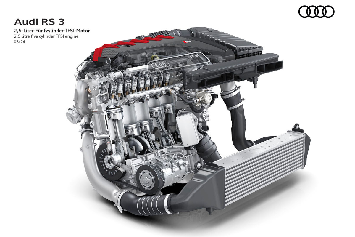 走行中は、5気筒ターボエンジンのサウンドは、1-2-4-5-3という点火順序から生まれており、エンジンの隣接気筒と離れた気筒が交互のパターンで点火するのが特長だ。