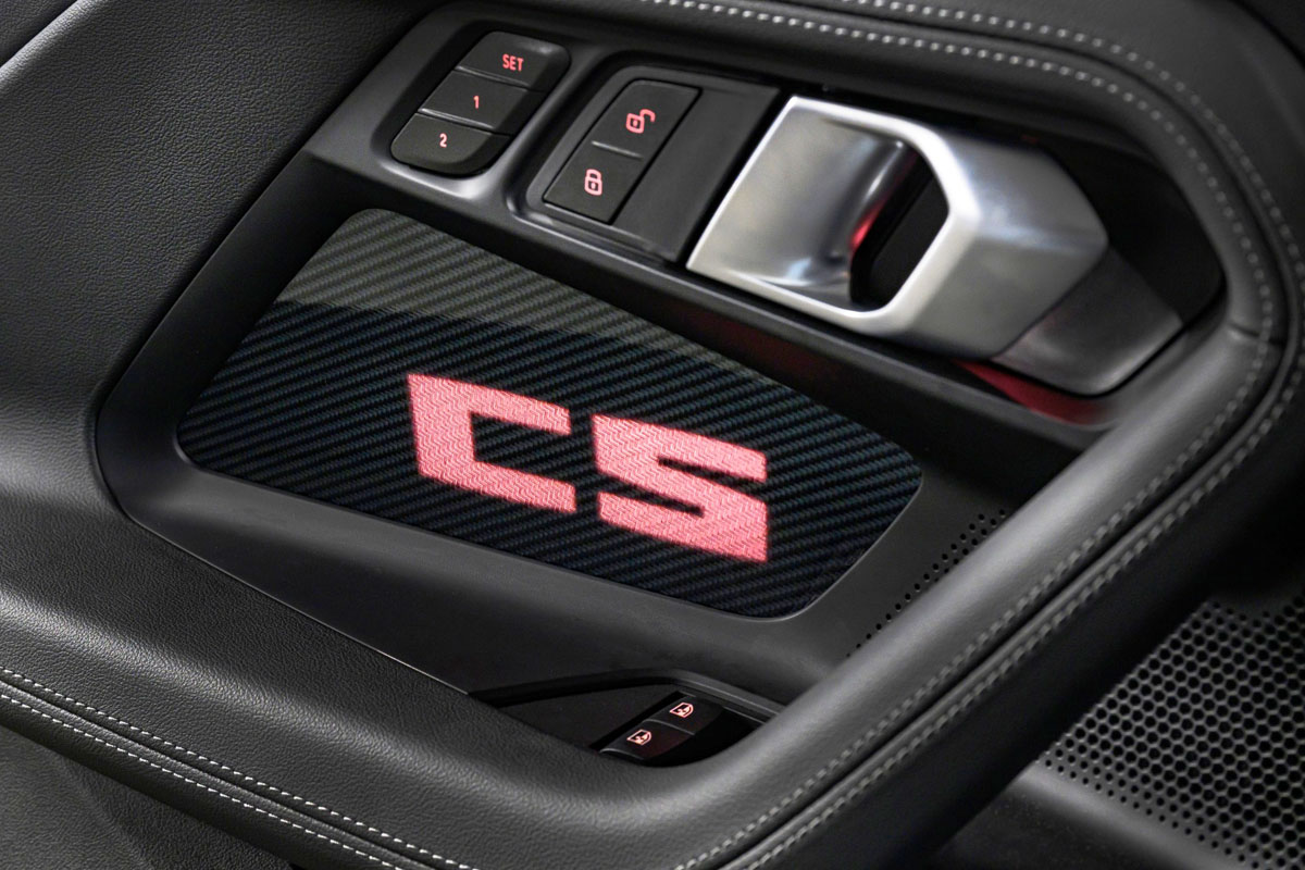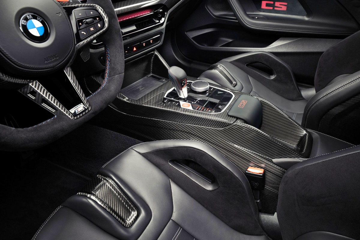インテリアは、センターマーク付きのMアルカンターラ・ステアリング、Mカーボンファイバー・トリム、専用CFRP製センターコンソール、CSロゴ・イルミネーション、前席にMカーボンバケットシート等を採用し、レースシーンに直結するデザインが印象的。一方で、リヤシートには大人2名が座れるスペースを確保しており、日常使いにも配慮している。