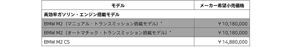 BMW M社が開発、製造するM2は、コンパクトなボディに、自然吸気エンジンのような官能的な吹けあがりと、ターボ・テクノロジーによる圧倒的なパワーを併せ持つ直列6気筒Mツインパワー・ターボ・エンジンを搭載し、セグメント唯一の後輪駆動と約50:50の理想的な前後重量配分を実現しており、BMW Mモデルらしい高いコーナリング性能を融合させ、究極のドライビングプレジャーを実現している。