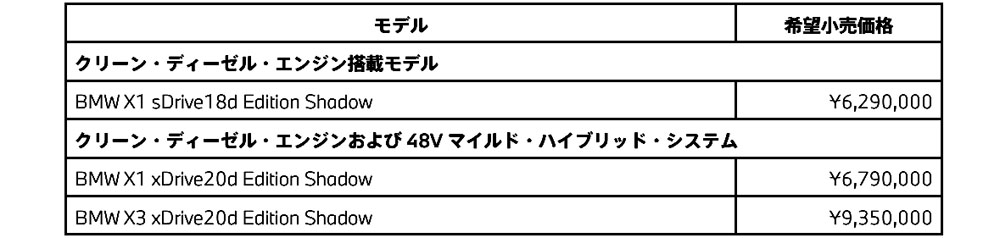 また同時に「X3」をベースにした「BMW X3 20d xDrive Edition Shadow」も450台限定で発売した。なおこれらの限定モデルのデリバリー開始は3月以降となっている。