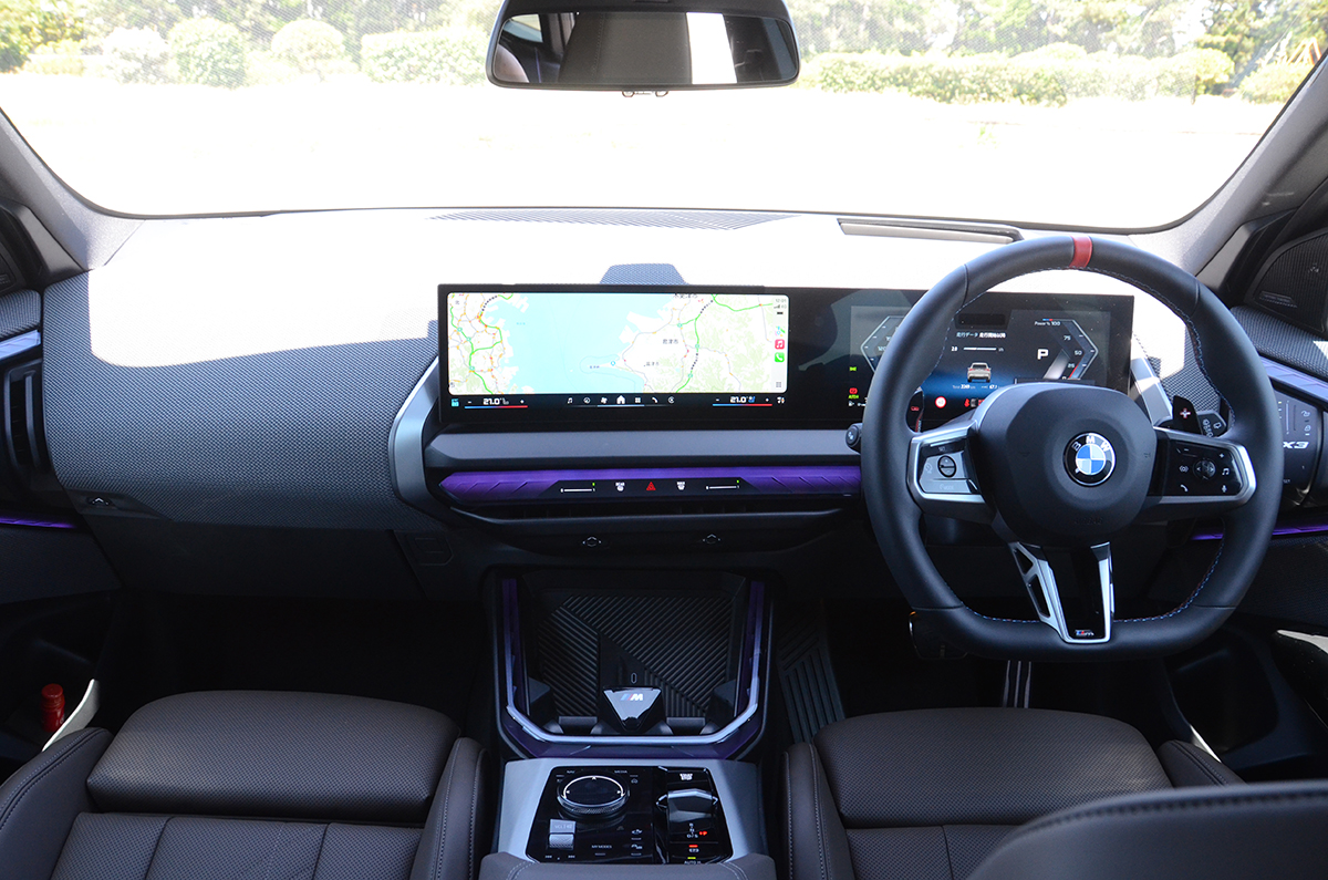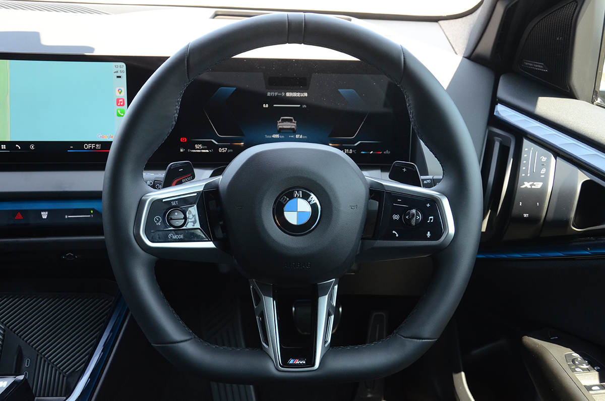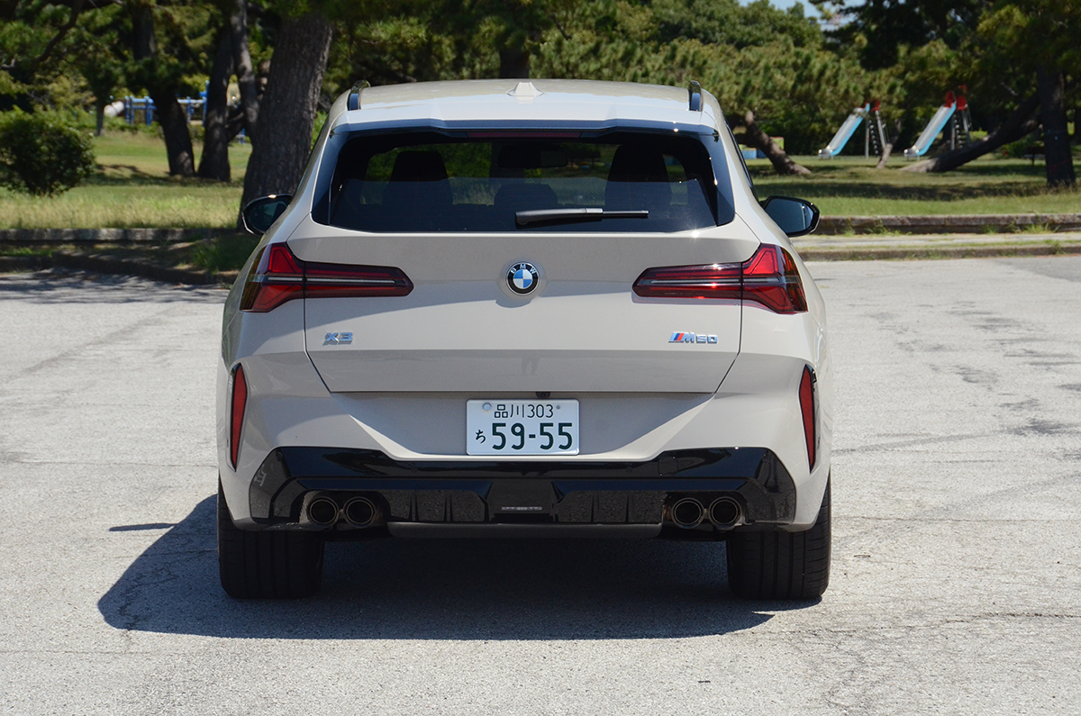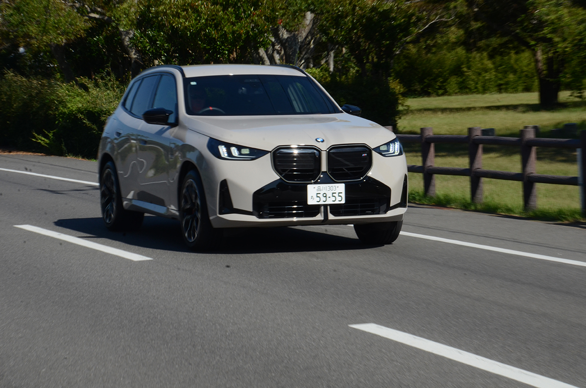 エンジンレスポンスはEVと同等レベルに感じるほど俊敏だ。48VのMHEVがいい仕事をしているのだろう、瞬時の加速は本当にEVのように反応しダッシュするのだ。ある意味、アクセルからの信号にワンテンポ遅れて反応するのがICEのネガかもしれないが、かつてはそういうものだった。それがEVの登場で、もっと素早くレスポンスすることを知ってしまうと、そのワンテンポの反応は「遅れ」として感じるようになってくる。しかし、このX3 M50はモーターの反応をうまく利用し、EVレベルのレスポンスとBMWならではの、滑らかさを武器にしているのだ。