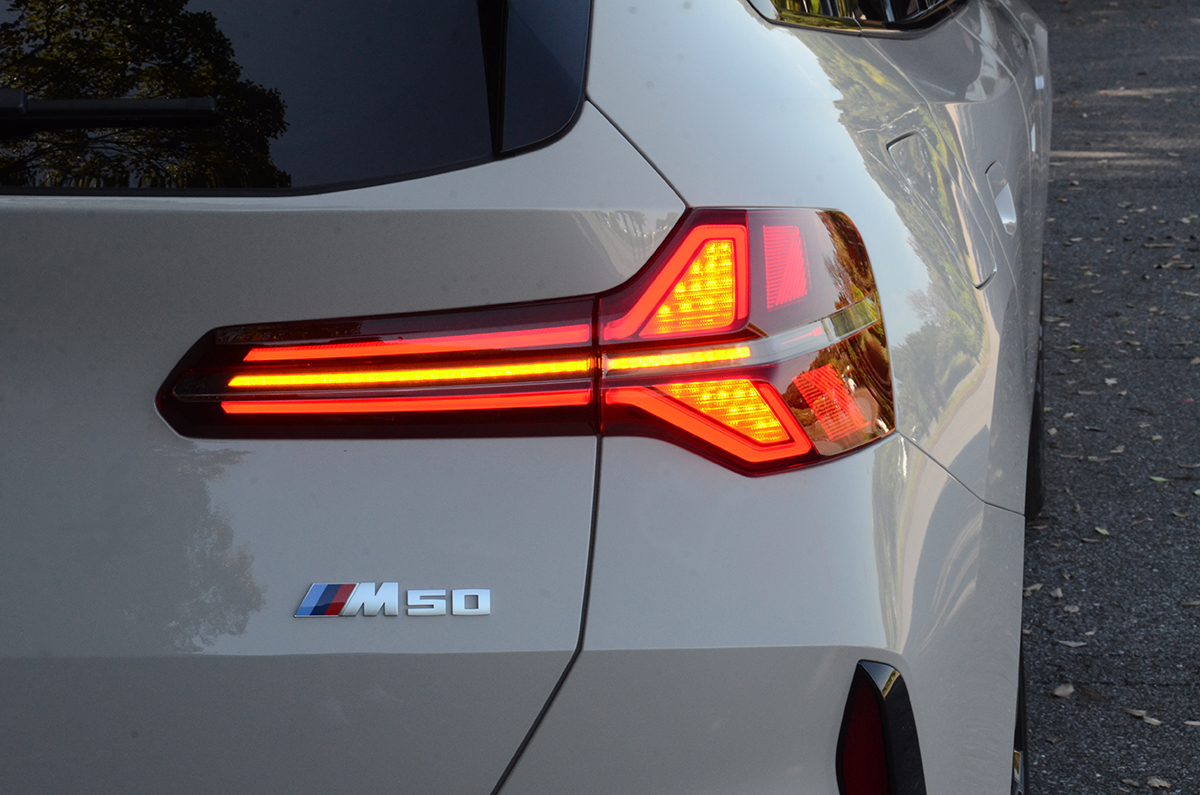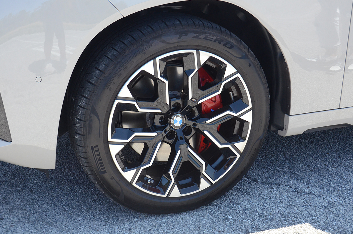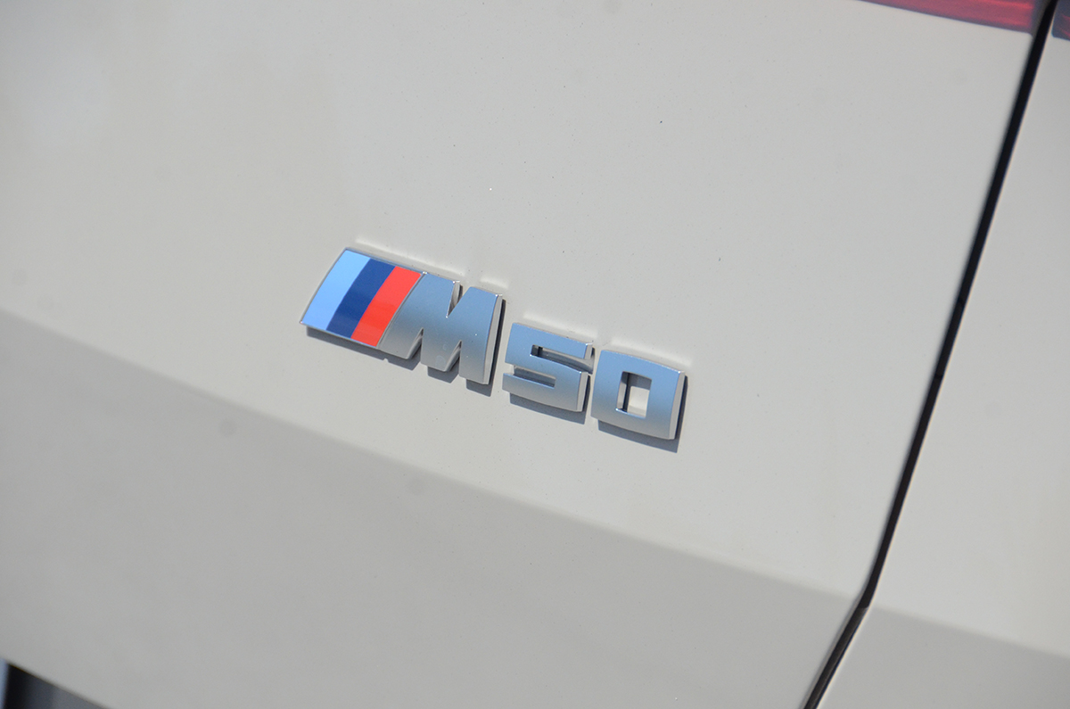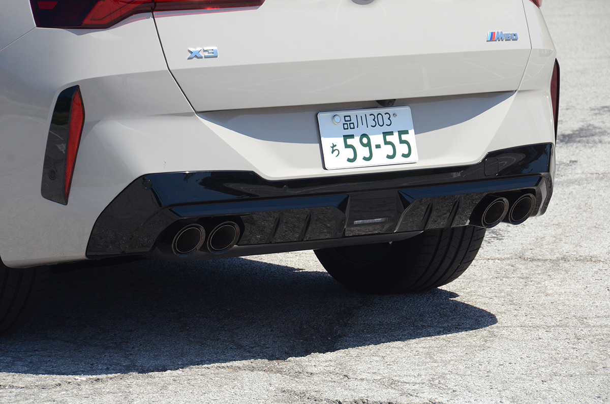 エクステリアは基本見分けにくい違いがある程度で、バッジの違い、そして左右4本だしのマフラーがMパフォーマンスモデルであることを発見する。もっとも足元は全く異なり、タイヤサイズも20dは245/50-19で、M50は255/45-20とワンサイズ大きい。またブレーキキャリパーもM50は赤く塗られMのロゴも付いているので、スポーツモデルであることはすぐにわかる。