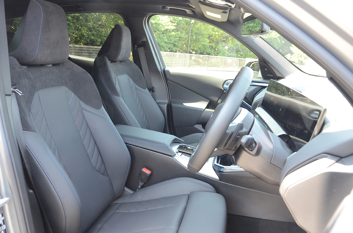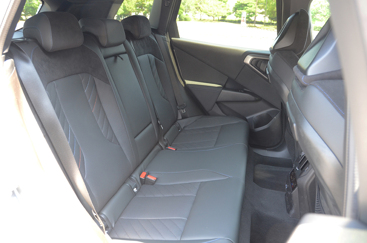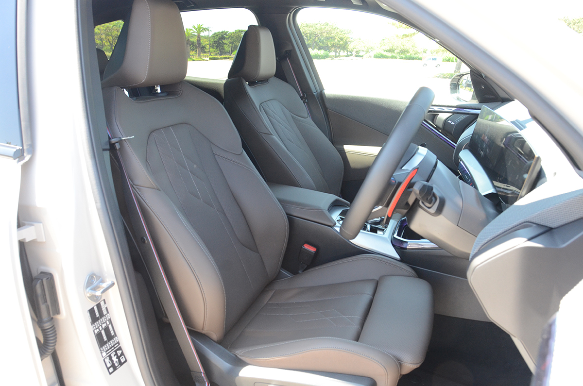 フロントのレザーシートのショルダー部にはアルカンターラが使われ、M Sportカラーの赤、青、白のステッチがシートバックに効果的に入れてある。