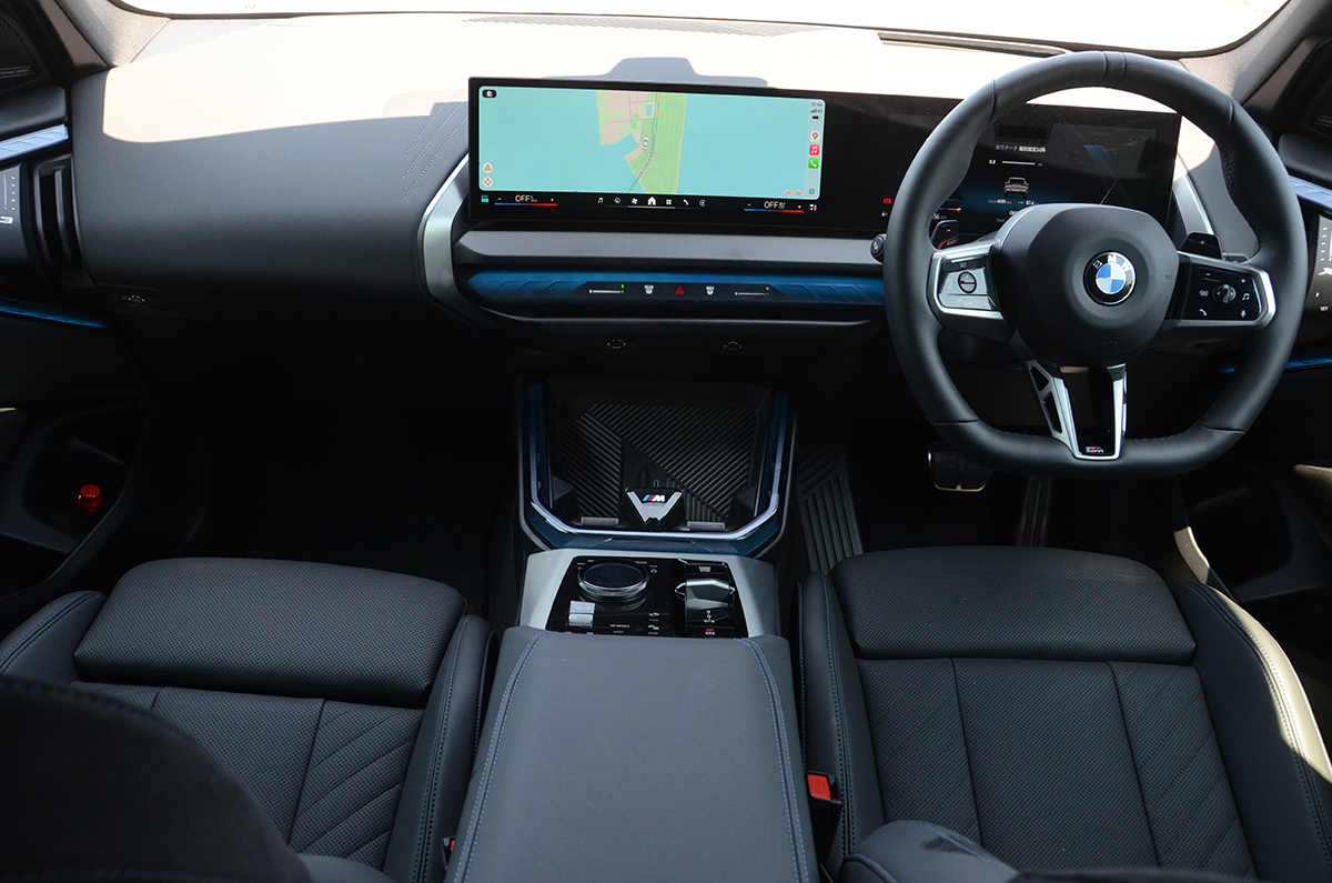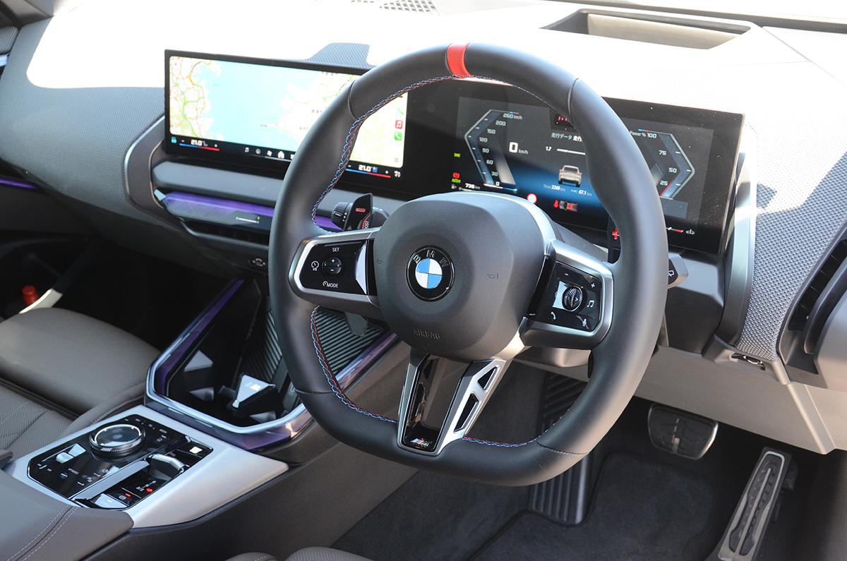 インテリアはよりM モデルらしく、ステアリングは赤レザーでセンターを示し、レザーステッチも赤、青を使って視覚効果も高くなっている。
