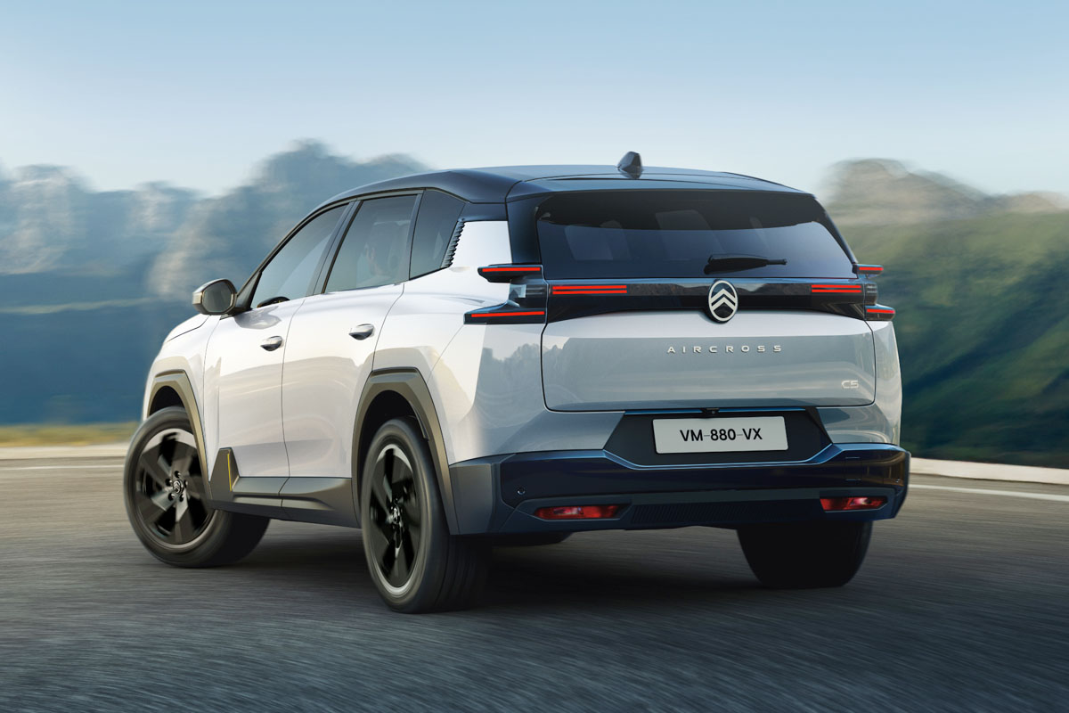 リヤには、3本のラインを組み合わせたデザインのテールランプを採用。奥行きを感じさせる立体的な光の表現により、後ろ姿からも新型「C5エアクロス」の個性と先進性を際立たせている。