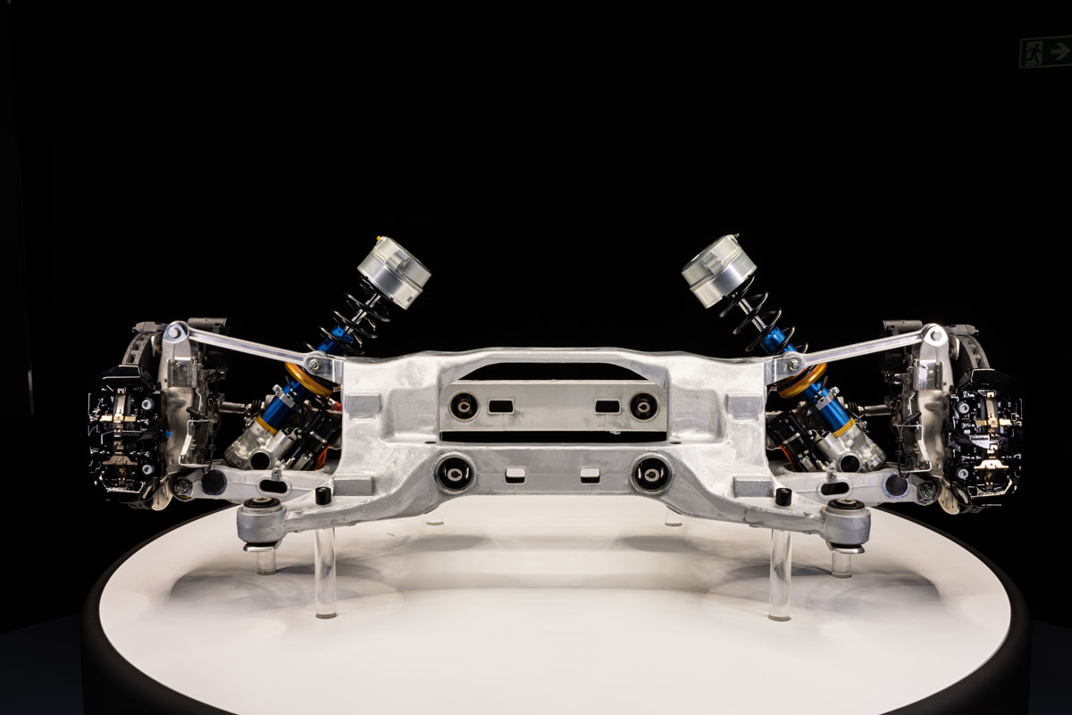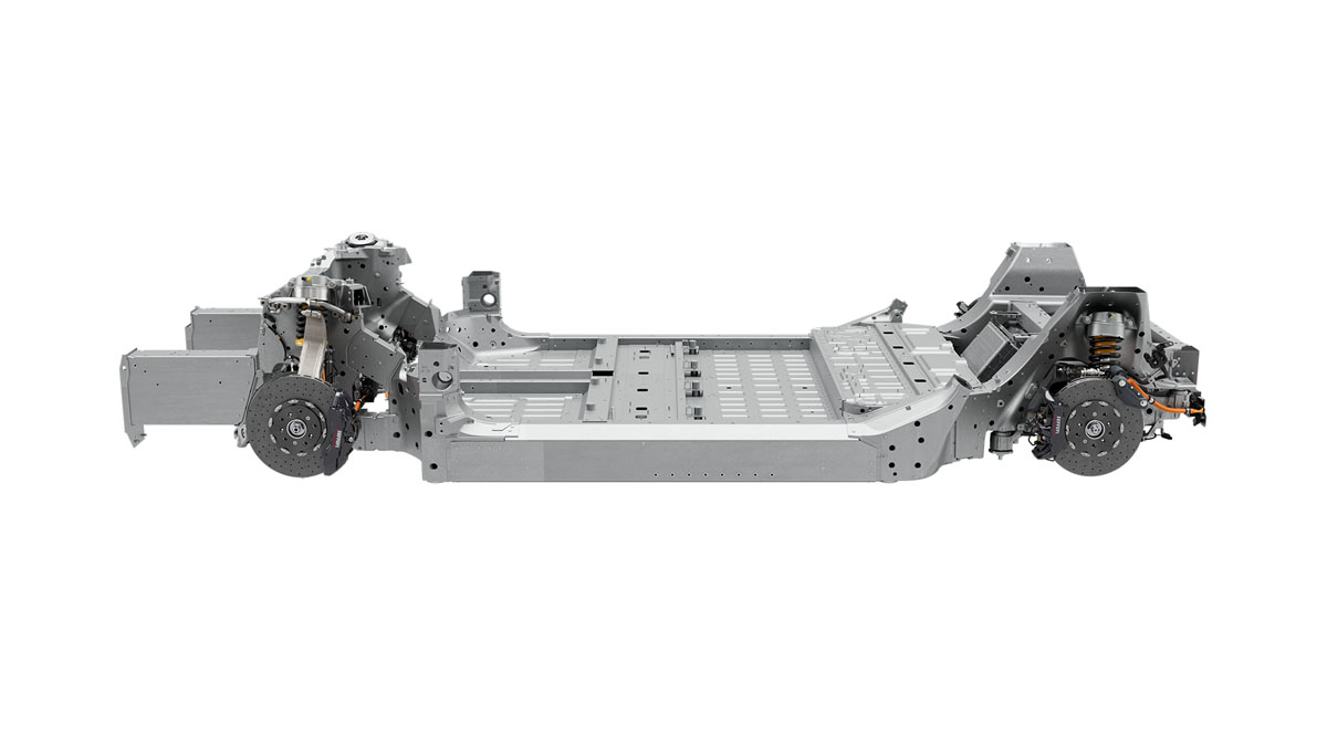 プラットフォームは、短いオーバーハングで、ドライバー・ポジションは前進しており、フロア全面にバッテリーパックを配置している。バッテリーの85%がフロアの最も低い部分に搭載されており、その結果大幅な重心の低下を実現。内燃エンジン車に比べると重心高は80mmも低められており、これにより傑出した運動性能がもたらされている。