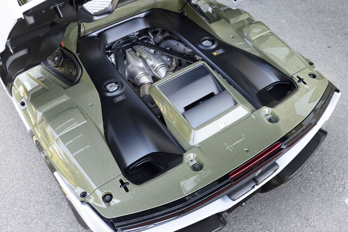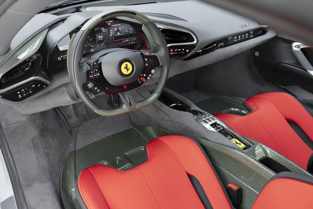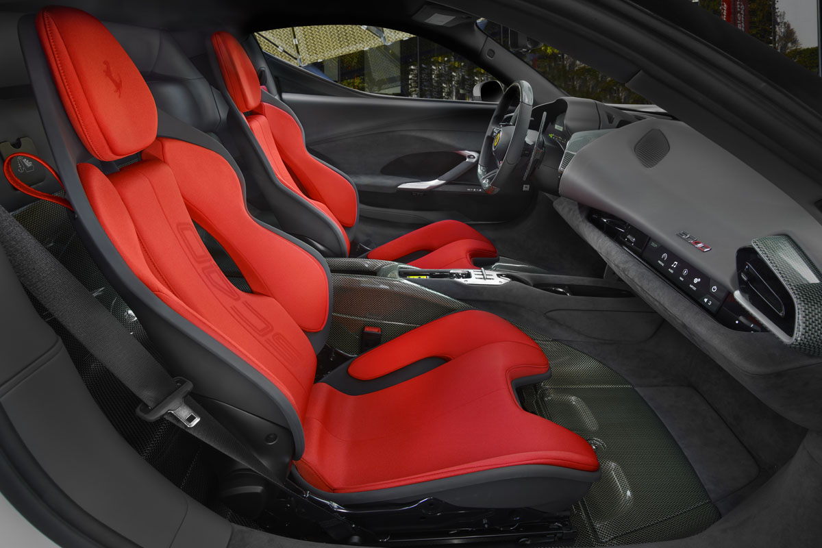 インテリアも、F40を想像させる仕上げで、ケブラー素材がシート背面やステアリングホイール、ダッシュボードの一部、エンジンベイなどに使用。シート表皮はチャコール・アルカンターラと赤のジャガード・テクニカルファブリックのコンビとし、ヘッドレストに跳ね馬ロゴと織り込まれたSC40ロゴを配置している。
