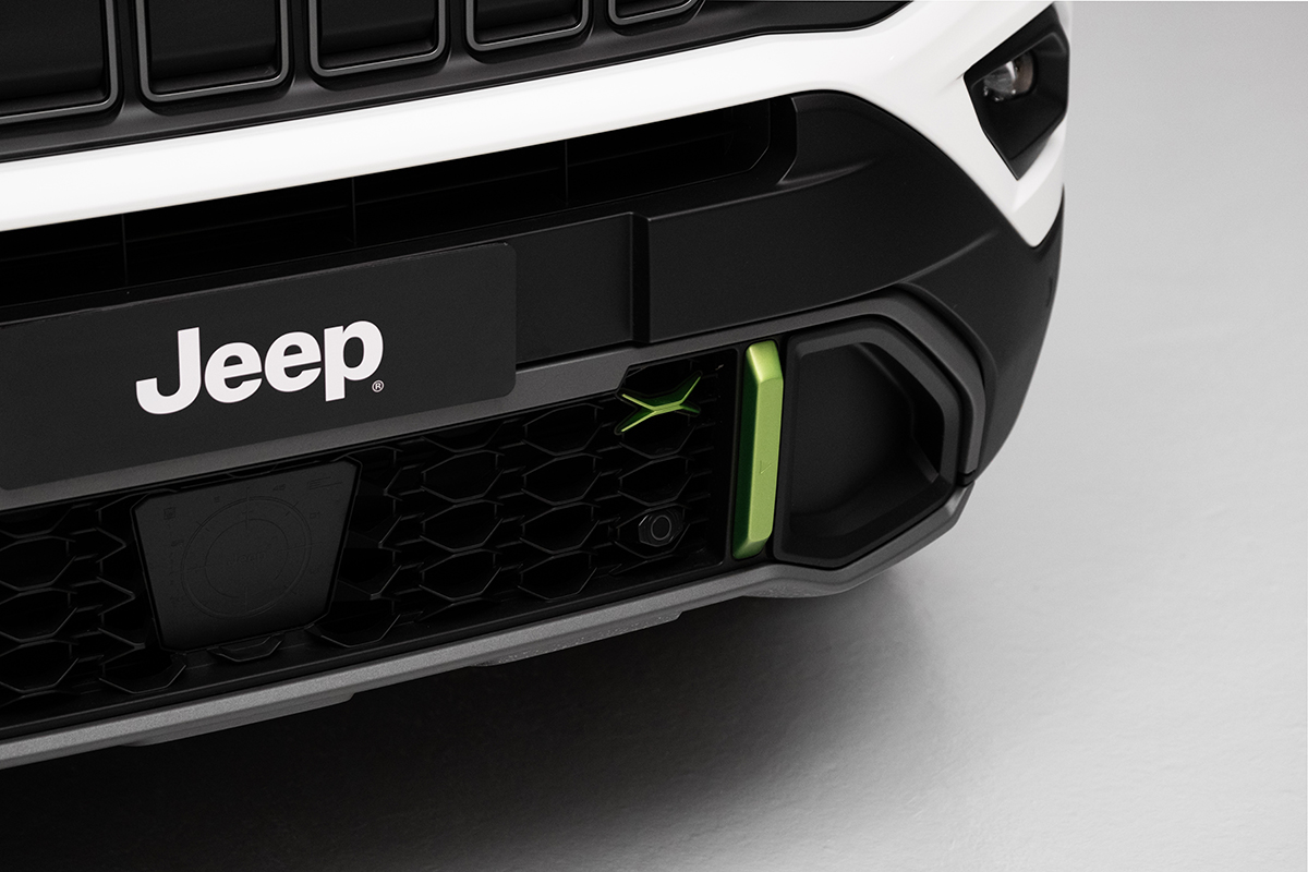 悪路走破性を高めた4xe Hybridは渡河性能400mm。フロントバンパー下部の地上高400mmの位置に、ジープダックのマーキングが施される遊びゴコロも楽しい。