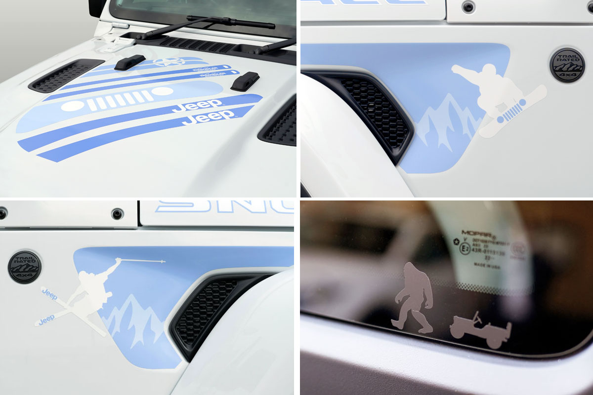 これらのデカールは、アメリカ本国のプロダクトデザインチームと共同で制作。左リヤガラスには、ジープの原点ともいえるウイリス MBと雪男が並んで歩くシルエットを施すなど、遊び心あふれるディテールも加えている。
