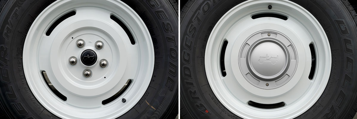 そしてもうひとつの特長は、印象の異なる2通りのスタイルを楽しむことができる2-Wayホイールだ。ホイールデザインのひとつは、ウイリス MBのスピリットを受け継ぐコンセプトカー「Willys ’41」から着想を得たクラシカルな佇まいとし、シルバーの大型キャップを装着すると力強い存在感を放つ。いずれのセンターキャップにも、ウイリス MBのシルエットが刻印されている。