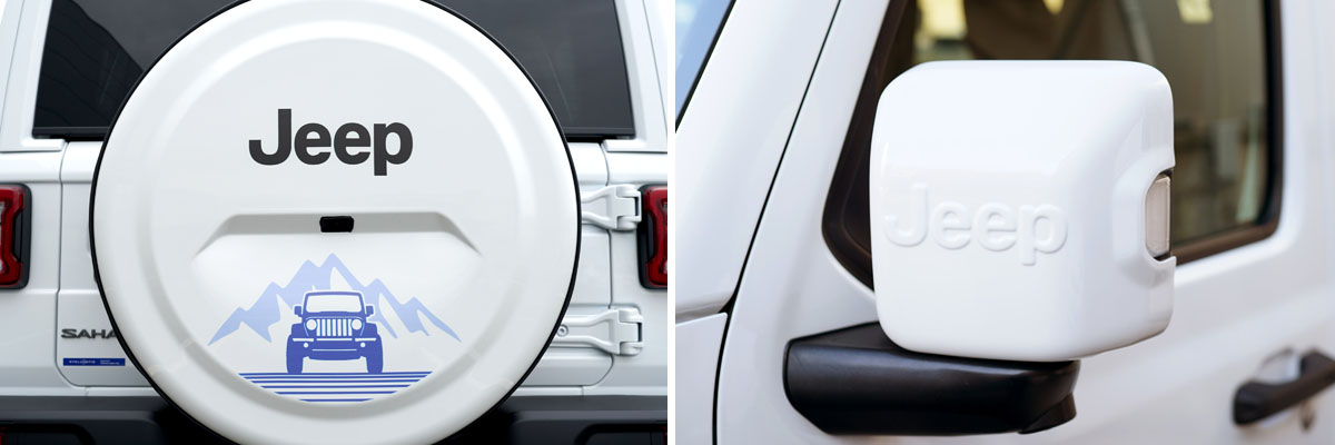 リヤの背面には、ラングラーのイラストをプリントしたホワイトのハードタイプスペアタイヤカバーを装備し、ジープ・ロゴ入りのホワイトドアミラーキャップとあわせて、白銀の世界をイメージした仕上がりとなっている。