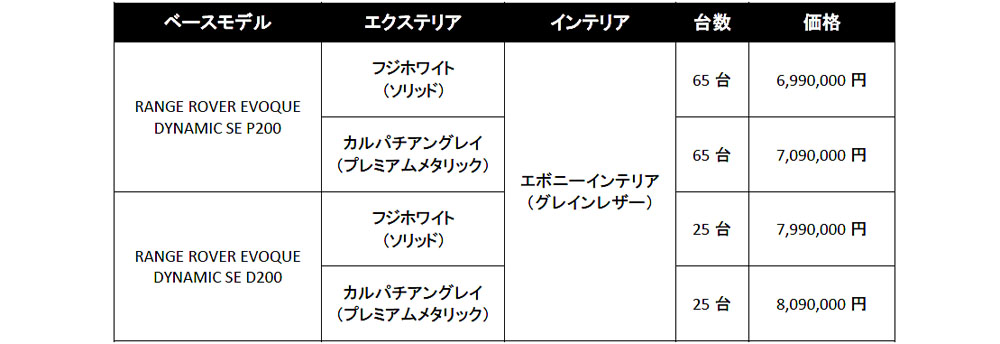 パワートレインはガソリンエンジンモデルの「レンジローバー イヴォーク ダイナミック SE P200」と、マイルドハイブリッド(MHEV)搭載のディーゼルエンジンモデル「レンジローバー イヴォーク ダイナミック SE D200」の2種類をベースに、人気のオプションコールドクライメートパックも装備している。