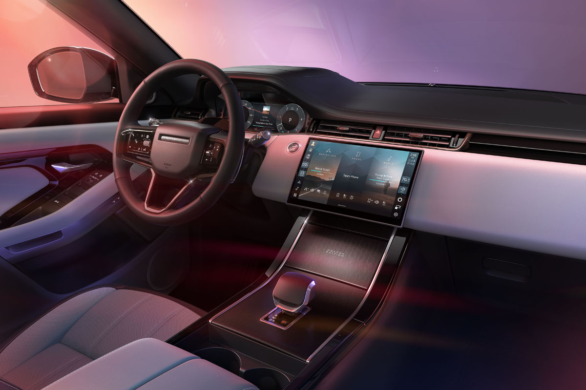 インテリアは、コントラストステッチを施したレザーシートがキャビンの質感を引き立て、イルミネーション機能付き「ホクストン・エディション」トレッドプレート、シグネチャーグラフィックをあしらったブラックブラッシュドアルミニウムフィニッシャー仕上げとすることで精巧な雰囲気を醸し出し、「レンジローバー イヴォーク」ならではの都会的な雰囲気を強調している。