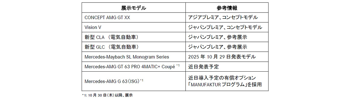 メルセデス・ベンツ日本は2025年10月1日、「ジャパンモビリティショー2025」の出展概要を発表した。日本初公開の「コンセプト AMG GT XX」、新型「CLA」「GLC」などを参考展示する。