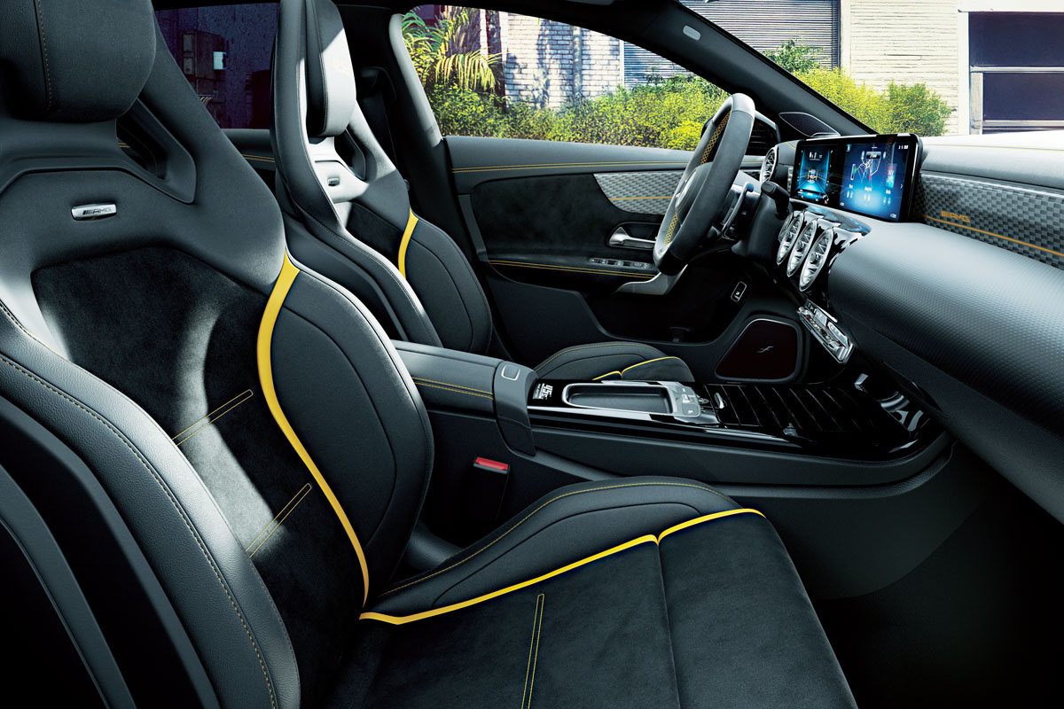 シャーシは通常モデルでは有償オプションの「AMG RIDE CONTROLサスペンション」を採用し、インテリアでは「マルチコントロールシートバック(運転席・助手席)」、「ヘッドアップディスプレイ」、「AMGリアルパフォーマンスサウンド」、「ブランドロゴプロジェクターライト」を標準装備している。