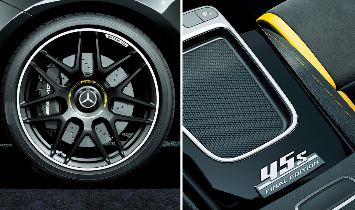 専用ハブキャップを備えた「19インチAMGアルミホイール(鍛造)」や、ドアミラーカバー、ファイナルエディション専用デカールにはダーク調のデザインに映えるイエローアクセントを加えている。また、「AMGエアロダイナミクスパッケージ」や「AMGエアロダイナミクスパッケージ+」などエアロパーツも装備。その他に、通常モデルでは有償オプションの「パノラミックスライディングルーフ」を標準装備としている。