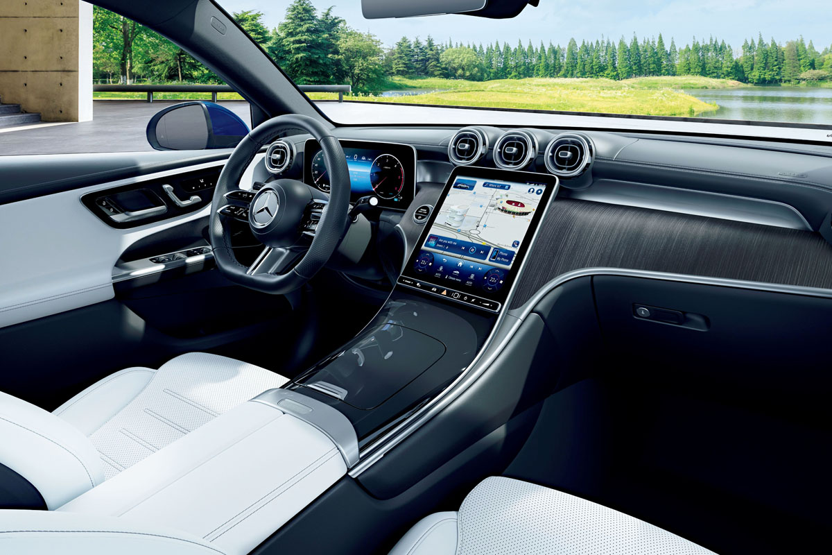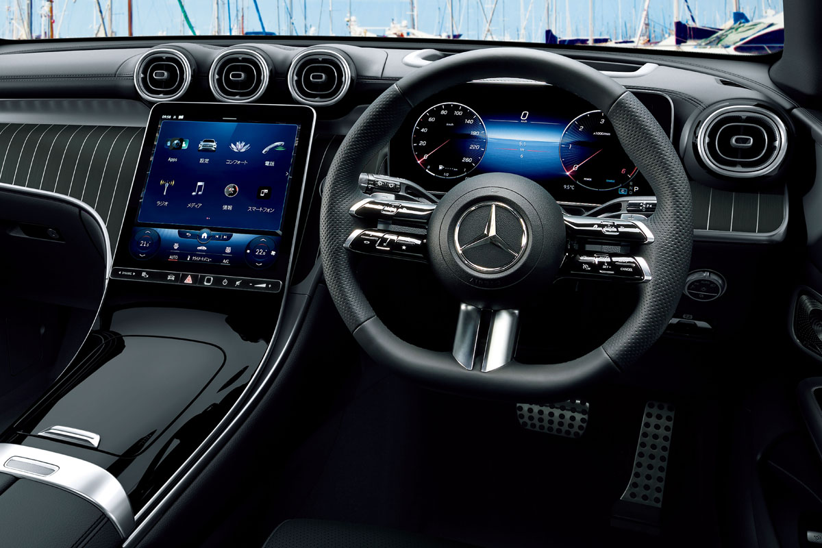 インテリアもAMGラインパッケージを装備。AMGラインインテリアやスポーツシート、本革巻きスポーツステアリングホイール(ナッパレザー)でスポーティさ強調。さらに、リアルウッドのアンスラサイト・ライムウッドインテリアトリムも組み合わされ、後席の左右席にはシートヒーターが装備されている。