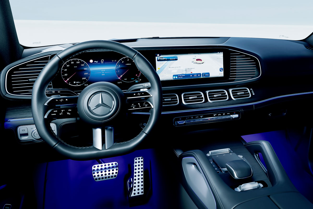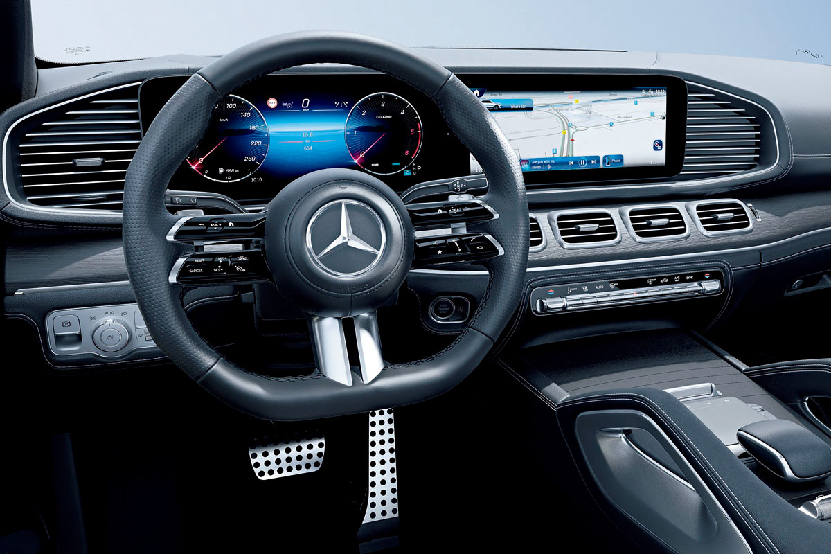 装備は、本革(ナッパレザー)仕上げのインテリアに、23インチAMGアルミホイール、AMGラインエクステリア、アンスラサイト・オークウッドインテリアトリム、イルミネーテッドステップカバー(ブラック)、ナイトパッケージ、ノイズ軽減タイヤ、本革(ナッパレザー)巻きスポーツステアリングとなっている。