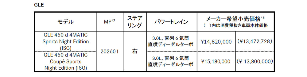 「GLE450d 4MATICスポーツ・ナイトエディション」と「GLE450d 4MATICクーペ スポーツ・ナイトエディション」は、「ナイトパッケージ」を採用し、ドアミラーやフロントリップ、リヤバンパーなどがブラックになり、ドアハンドル上部はダーククローム仕上げとなる。さらにブラック塗装の22インチAMGアルミホイールも装着されている。