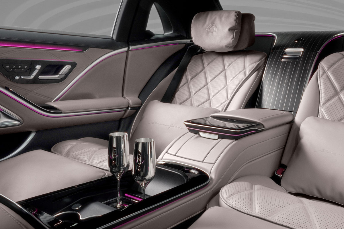 シートは通常モデルでは有償オプションの「MANUFAKTURローズ グレー/ブラック(ナッパレザー)」を採用。ヘッドレストにはマイバッハロゴの刺繍が施され、リヤにはシート同色のレザーを使用したクッションも備わっている。後席が左右独立シートとなるファーストクラスパッケージも採用し、クーリングボックスやシャンパングラスが備わる非日常的な移動空間を生み出している。