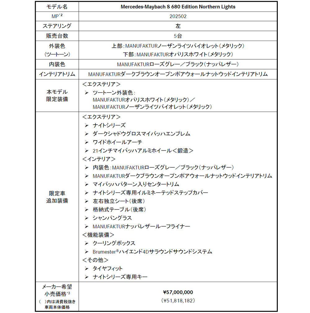 メルセデス・ベンツ日本は2025年9月19日、メルセデス・マイバッハSクラスの5台限定の特別仕様車「メルセデス マイバッハ S 680 Edition Northern Lights」を設定し受注を開始した。デリバリーは9月下旬以降が予定されている。