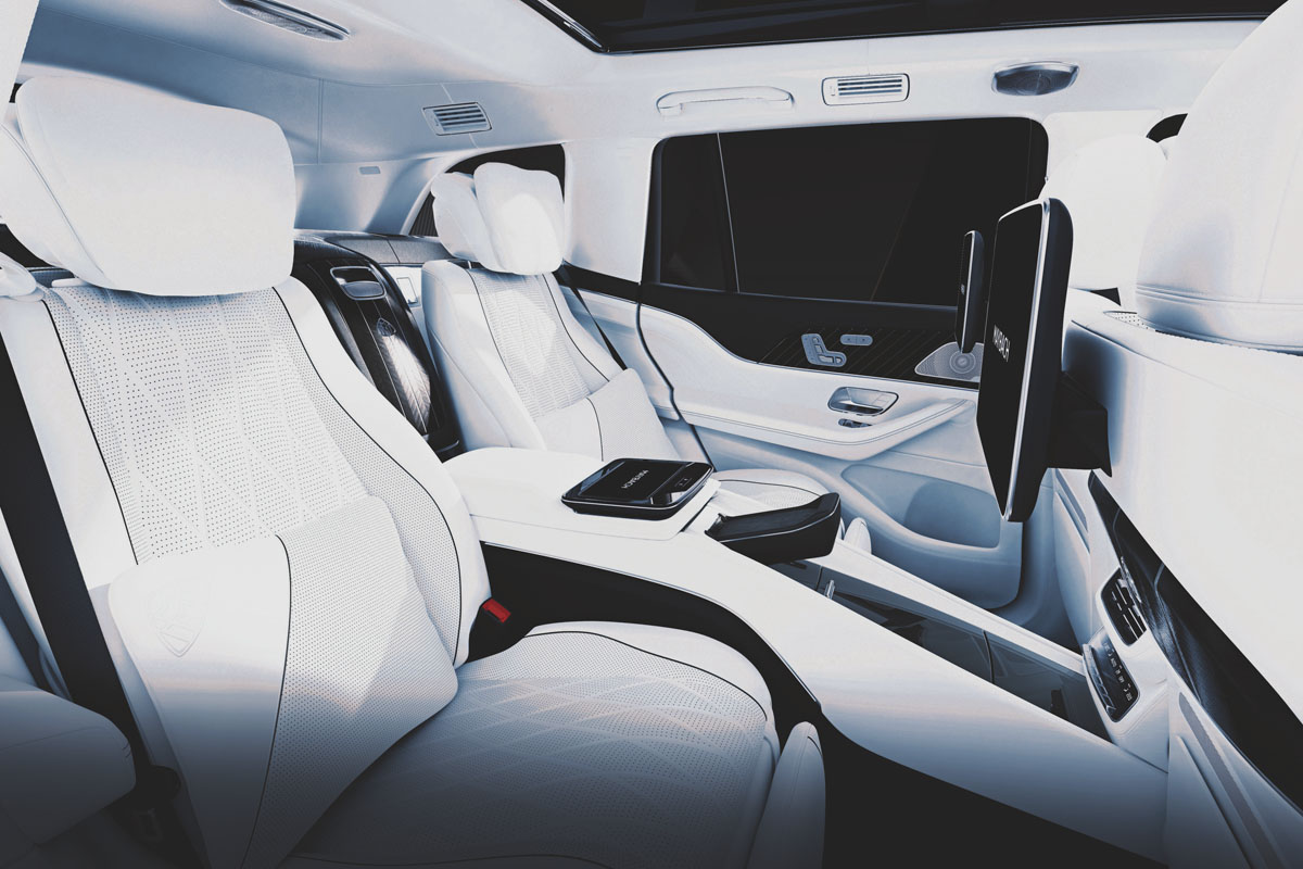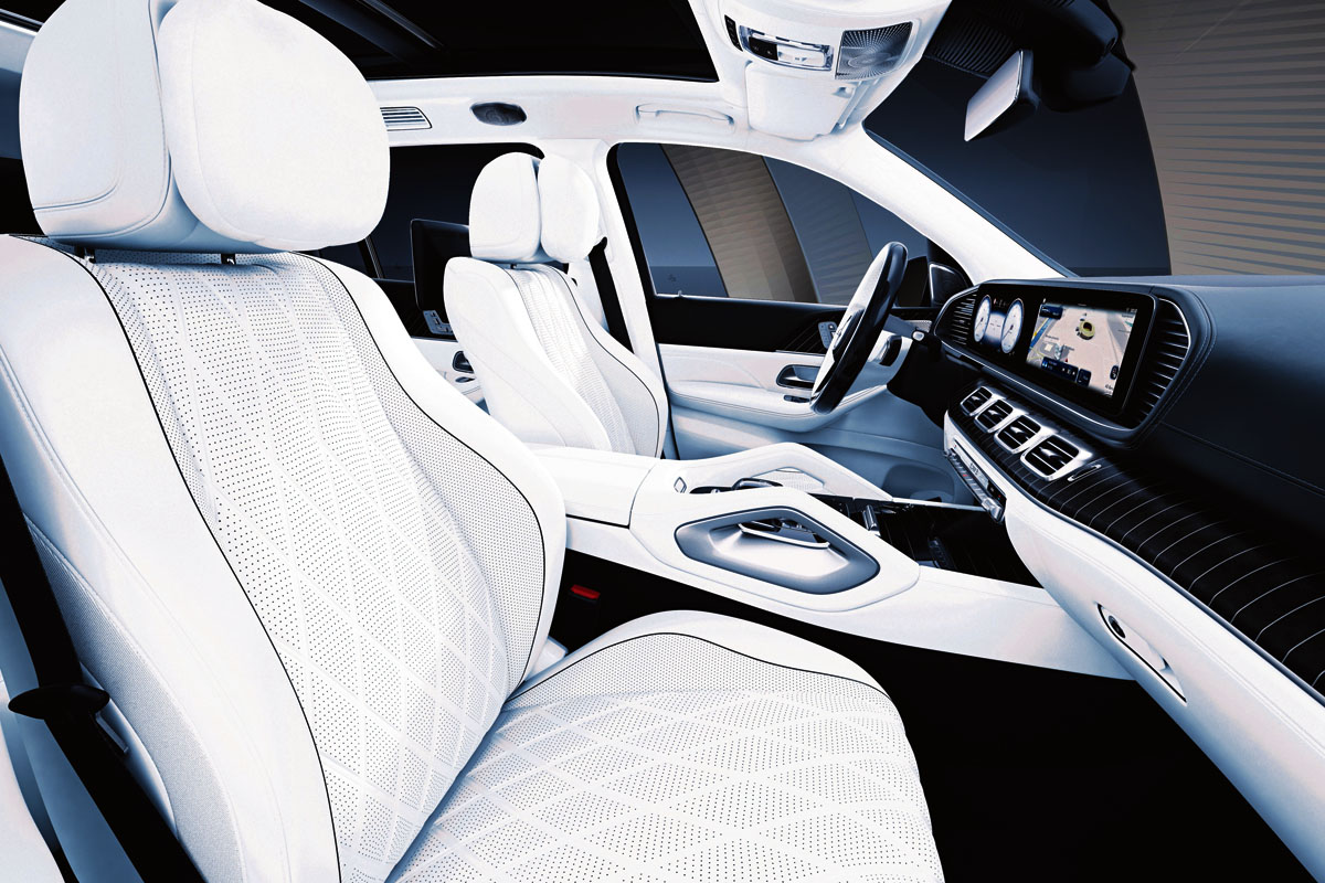 インテリアは、オールブラックのエクステリアとは対照的で、専用設定されたクリスタルホワイト/ブラックパールの本革(MANUFAKTURナッパレザー)シートを採用。ベーシックなメルセデス・マイバッハGLS600には設定のないMANUFAKTURダークブラウンオープンポア・ウォールナットウッドインテリアトリムや、通常は有償オプションとなるファーストクラスパッケージのラグジュアリーな専用装備が備えられている。