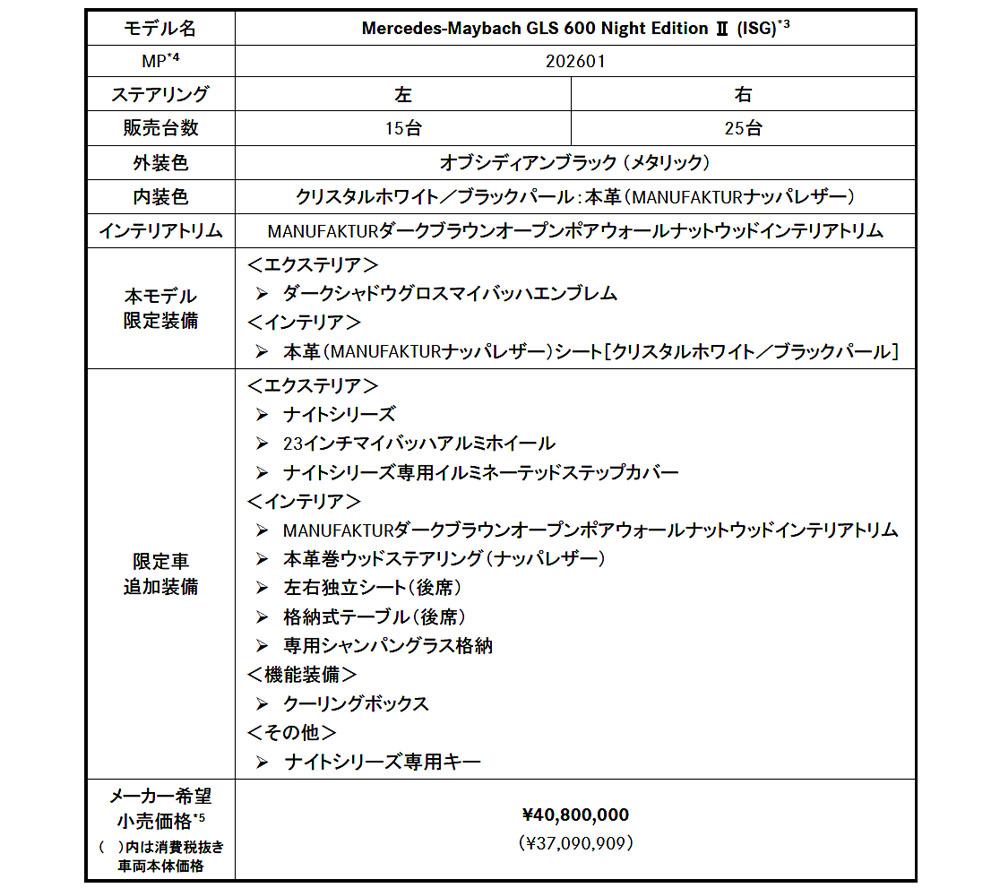 メルセデス・ベンツ日本は2025年11月19日、メルセデス・マイバッハのSUV「メルセデス・マイバッハGLS600」に、40台の限定車「Night Edition Ⅱ(ISG)」の予約受注を開始した。