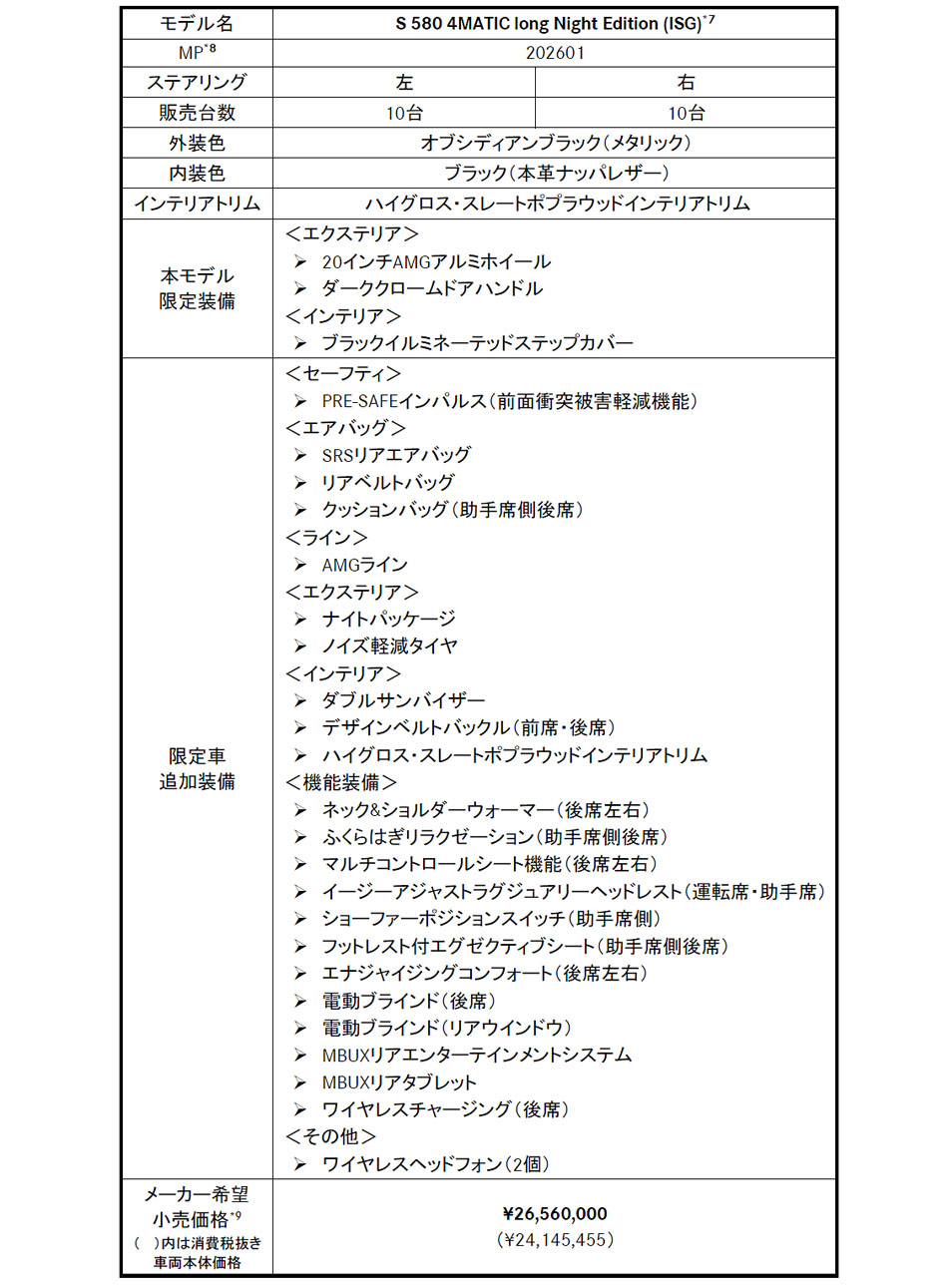 メルセデス・ベンツ日本は2025年9月25日、20台限定の特別仕様車「S 580 4MATIC long Night Edition(ISG)」の受注を開始した。なお、限定車は右ハンドル10台、左ハンドル10台となっている。デリバリーは10月以降の予定だ。