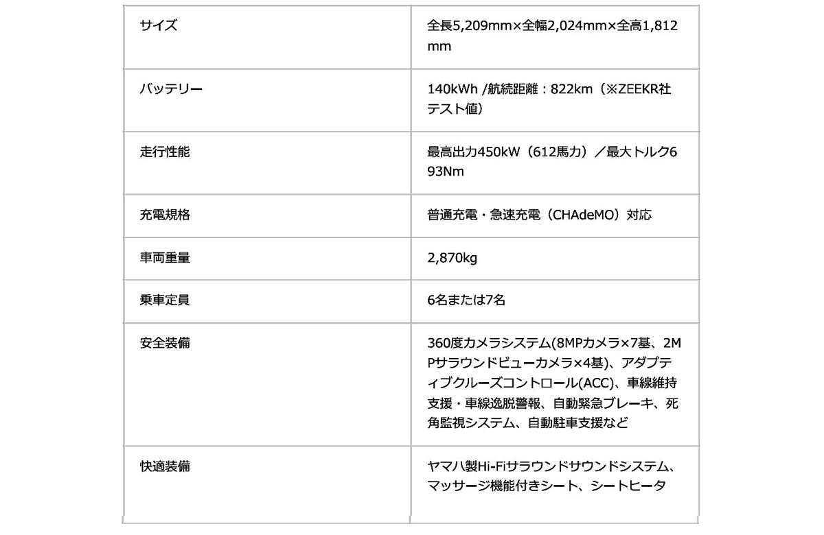 「ZEEKR 009」は、全長5209mm、全幅2024mm、全高1812mmという大型ボディのサイズで、最大7人が快適に過ごせる広大な室内空間を実現したハイエンド・クラスのMPVだ。日本におけるプレミアムセグメントで初となる大型電動MPVとして日本市場に登場することになる。
