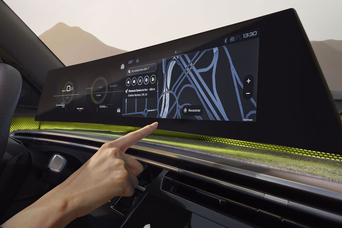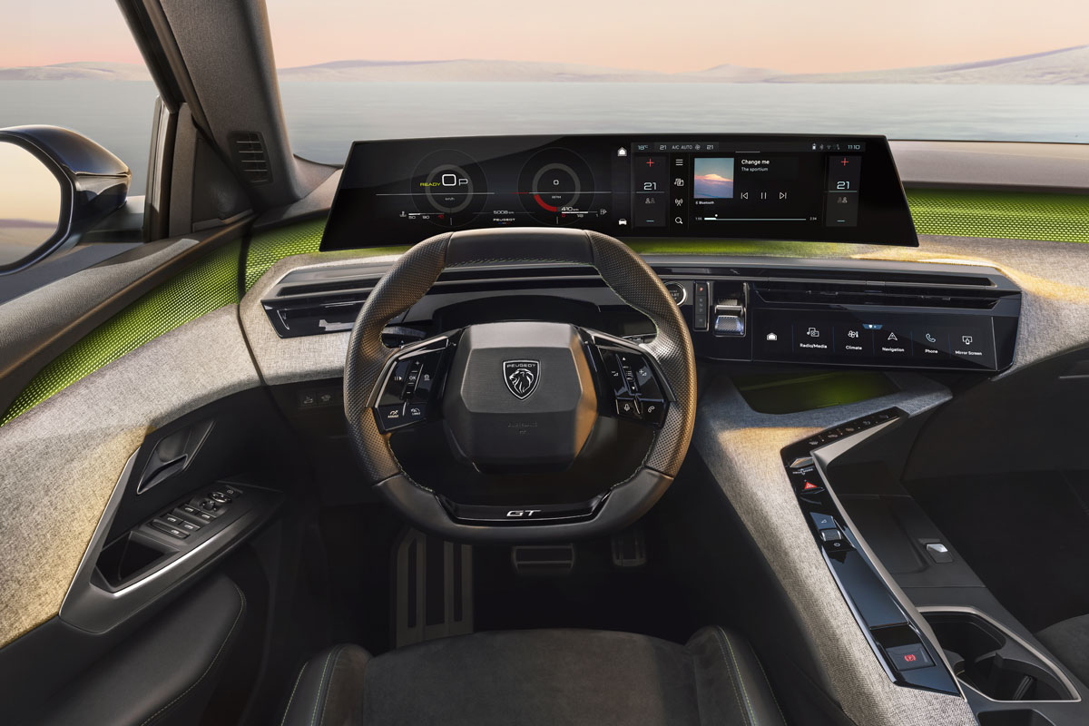 運転席には、プジョー独自の「パノラミック iコックピット」を採用。スクリーン表面がドライバーに向けてゆるやかにカーブした21インチのパノラミックカーブド・ディスプレイにより、視認性と操作性に優れた先進的なコックピットとなっている。