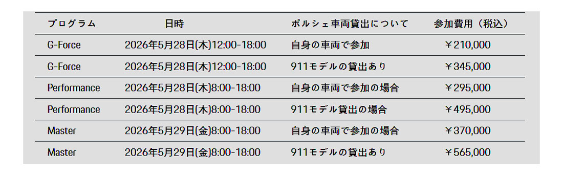 プログラムは、ドライバーのスキルに合わせて3つのレベル(G-Force 、Performance、Master)を設定し、2026年5月28日(木)、29日(金)の2日に分けて開催する。どのプログラムにも同行者プランの用意があり、見学も可能。