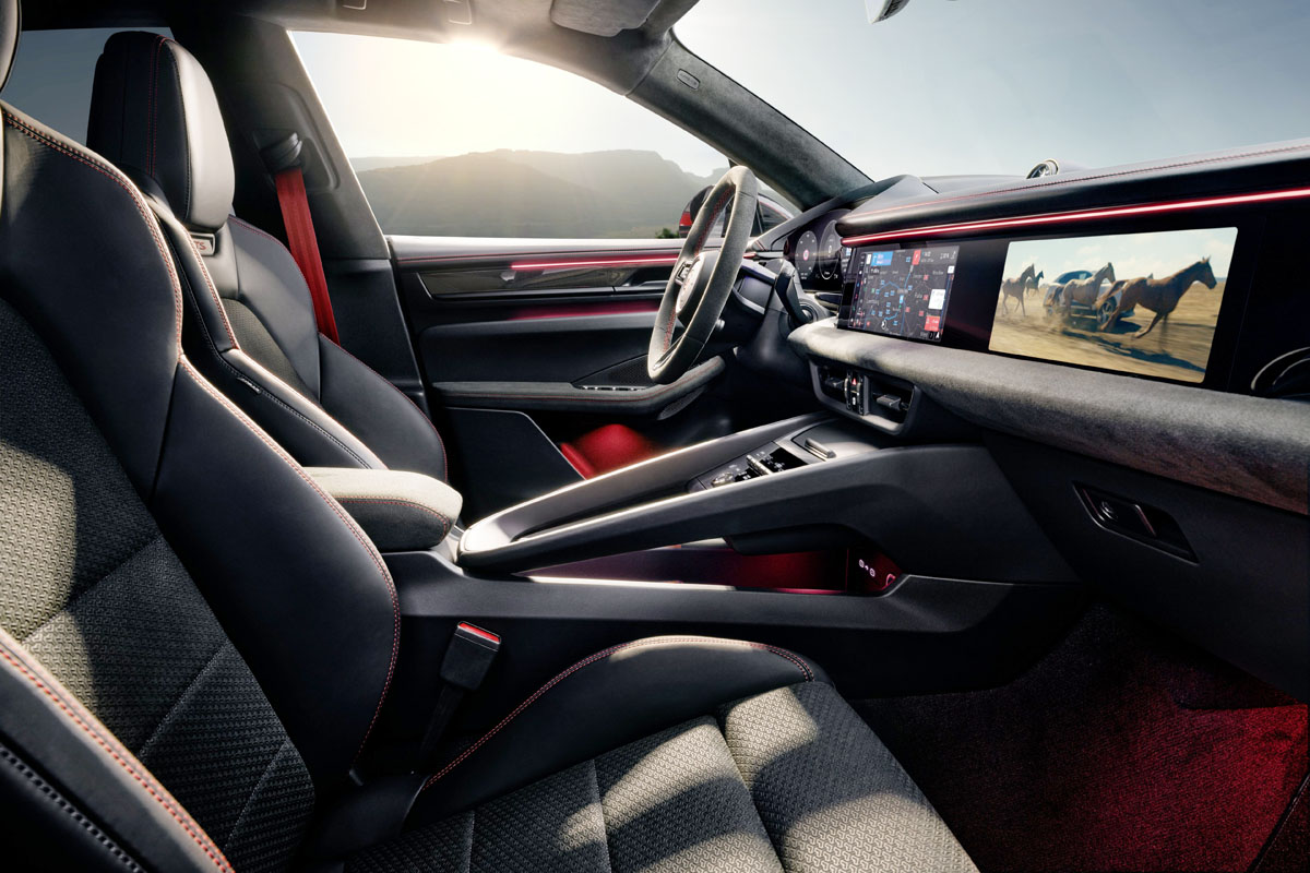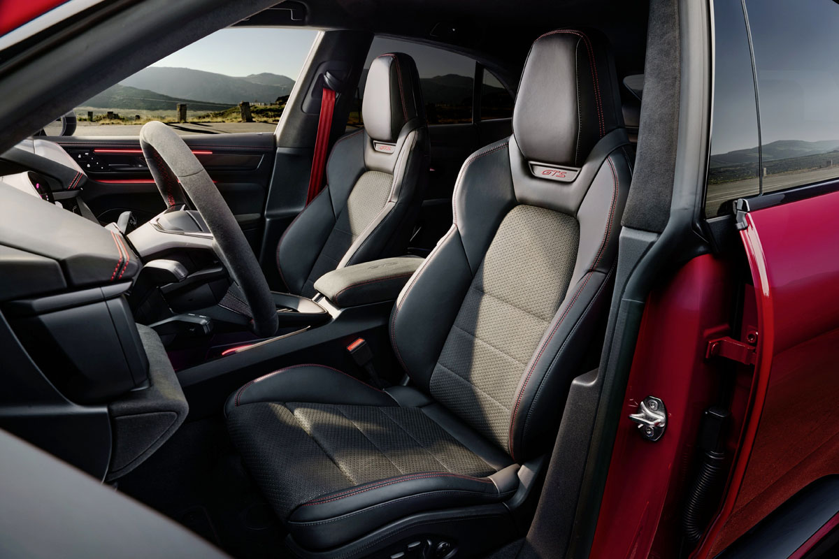 インテリアはブラックのスムースレザーエレメントを備えたRace-Texトリムを採用。オプションの「GTSインテリアパッケージ」を選択するとボディカラーに合わせたカラーコーディネートが可能になる。