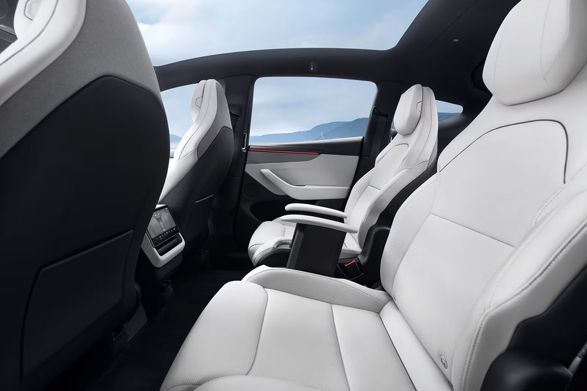 エクステリアはモデルYのデザインを継承し、より長いルーフ、Cピラー以降と、リヤスポイラーが新設計されている。Cd値0.216を実現したほか、風切り音を11%、ロードノイズを4%低減している。インテリアは、インスツルメントパネルの中央に16インチ・タッチディスプレイを装備。また2列目シートにも8インチ・タッチスクリーンを装備。オーディオは19スピーカー+サブウーファー、さらに天井設置の2スピーカーという構成だ。また、シート列に充電ポートが備えられている。