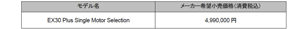 「EX30プラス シングルモーター セレクション」は、EX30のエントリーグレード「プラス シングルモーター」をベースにして、より快適性を高める装備を充実させた特別仕様車だ。