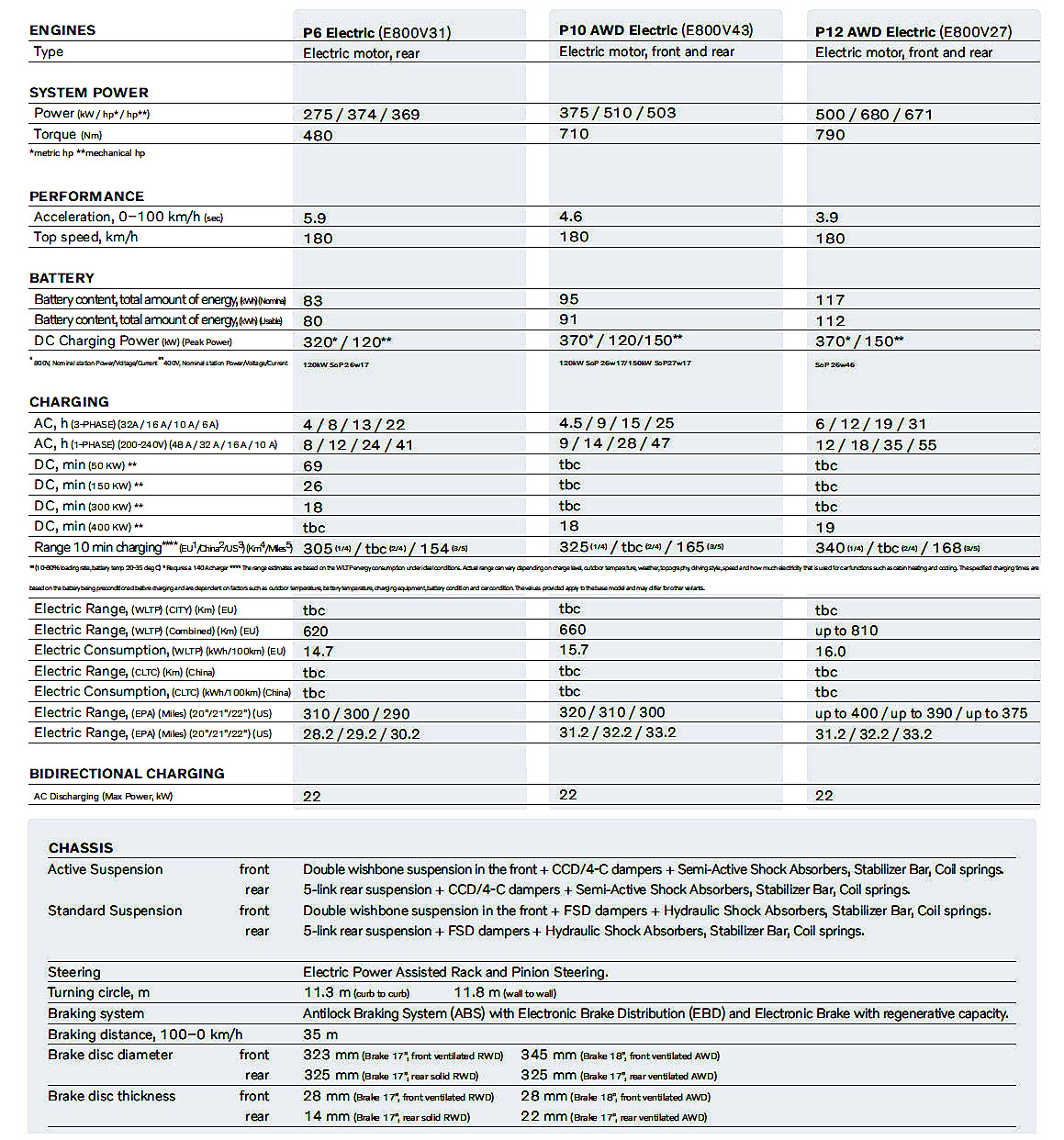 後輪駆動のP6 Electricは275kW(374ps)/480Nmを発生し、0-100km/h加速は5.9秒。P10 AWD Electricは前後モーター出力合計で375kW(510ps)/710Nmを発生し、0-100km/hは4.6秒。そしてトップモデルのP12 AWD Electricは前後モーター出力合計で500kW(680ps)/790Nmを発生し、0-100km/h加速は3.9秒という強力な動力性能を発揮する。