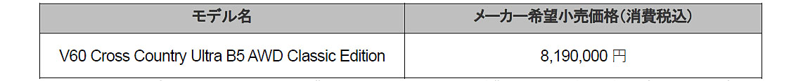 ボルボ・カー・ジャパンは2026年2月20日、クロスオーバーモデル「V60クロスカントリー」の最終モデルとなる特別仕様車「クラシックエディション」を設定し、200台限定で発売した。