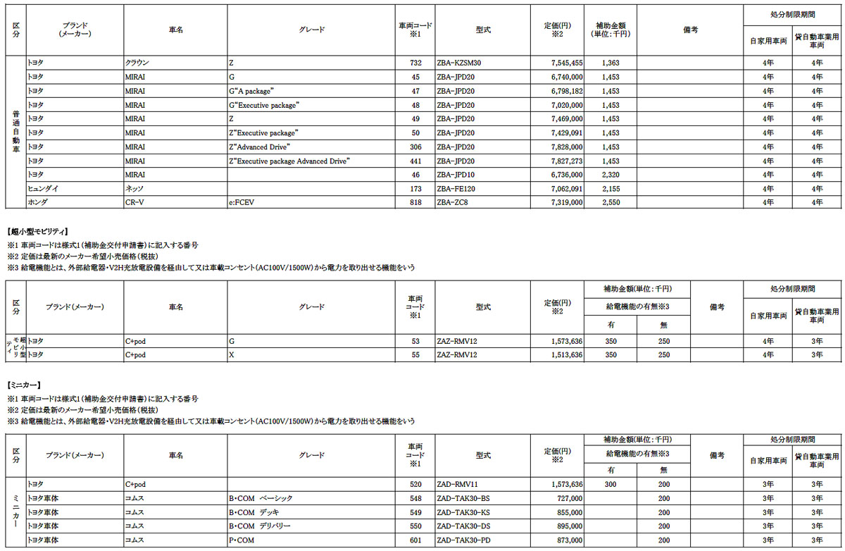最新の車種別補助金では、最高額はトヨタ、レクサス車の90万円、輸入車ではテスラが87万円となっている。